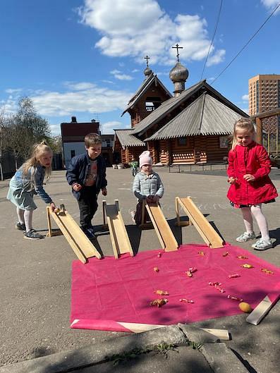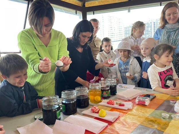 На первой «станции» интерактивной игры ребят ждал чтец храма святой равноапостольной Нины в Черемушках Михаил Виноградов, который рассказал участникам игры об иконографии иконы «Воскресение Христово», ребята учились понимать символический смысл иконописи и разгадывали кроссворд на тему праздника Пасхи. Далее команда переместилась на музыкальную «станцию», где их ждала педагог Воскресной школы храма Ксения Батарчукова, вместе с ней дети учились петь тропарь Пасхи. На следующей «станции»участников встретила педагог Воскресной школы храма Ангелина Волкова, она рассказала детям как праздновали Пасху на Руси дети, в какие игры они играли. Наши участники праздника тоже смогли поиграть: катали яйца носом и с горок. В завершении игры ребята прибыли на творческую «станцию», там общественный методист храма Ольга Григорьева, провела мастер-класс по окрашиванию пасхальных яйц воском.