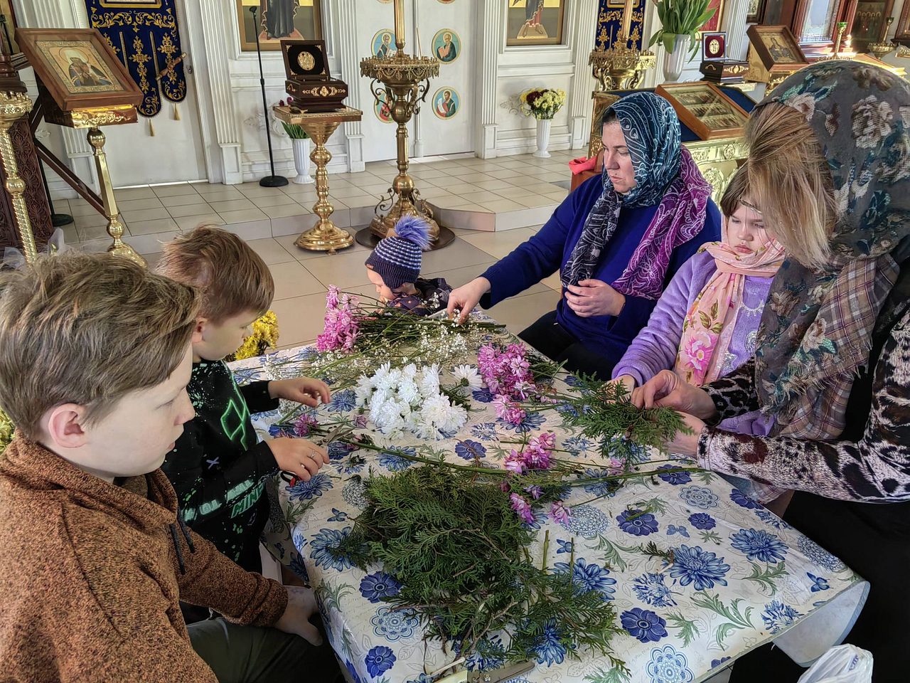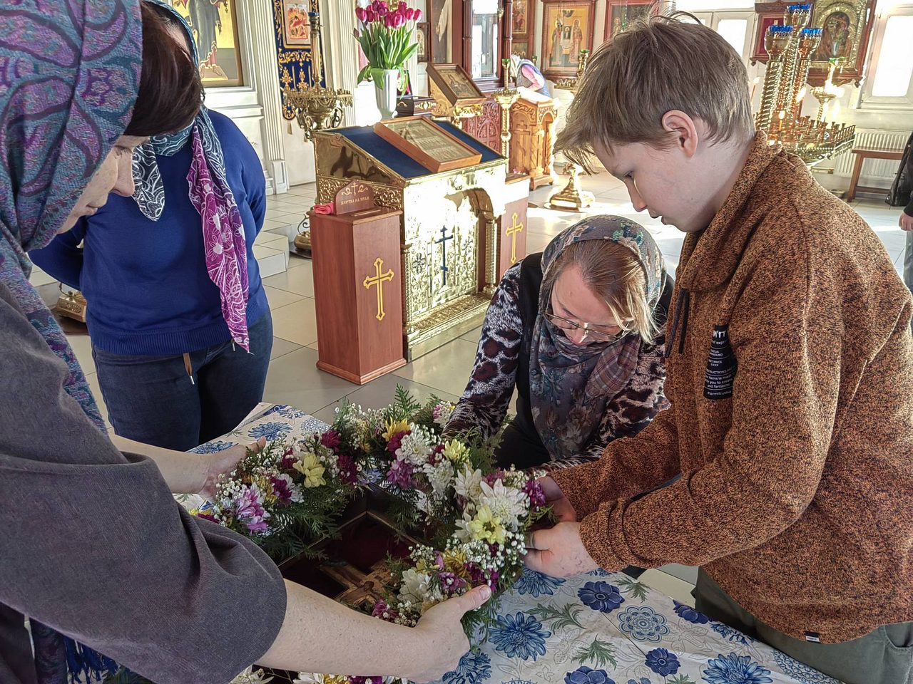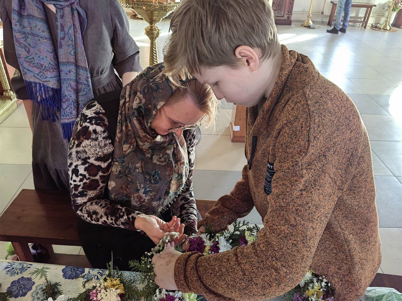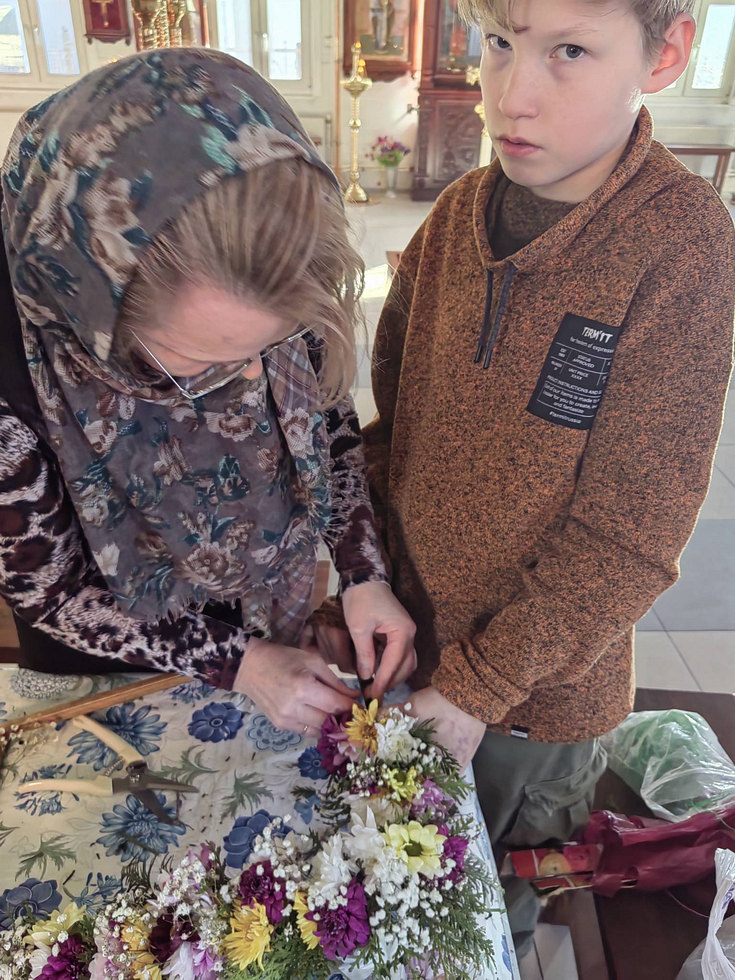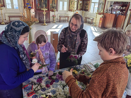 После совместной молитвы, под руководством Хрящевой Натальи, прихожане и и флориста храма ребята с родителями разбирали цветы, учились составлять из них букетики и украшали ими крест.