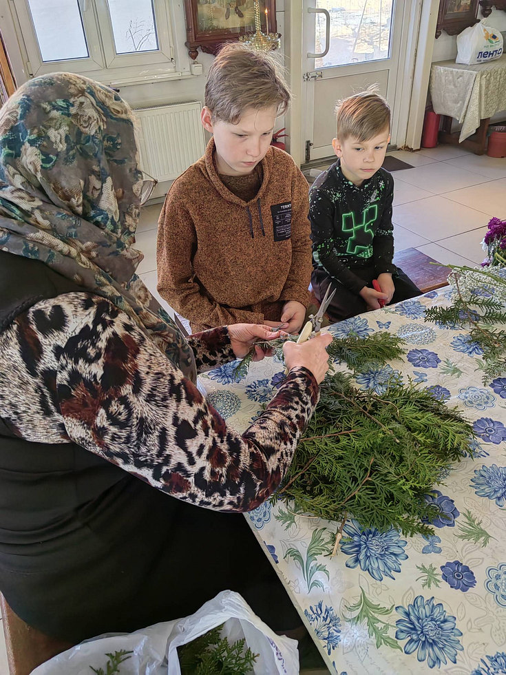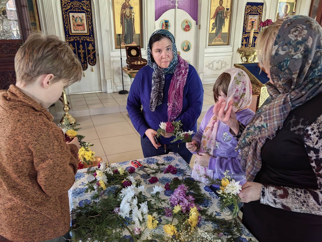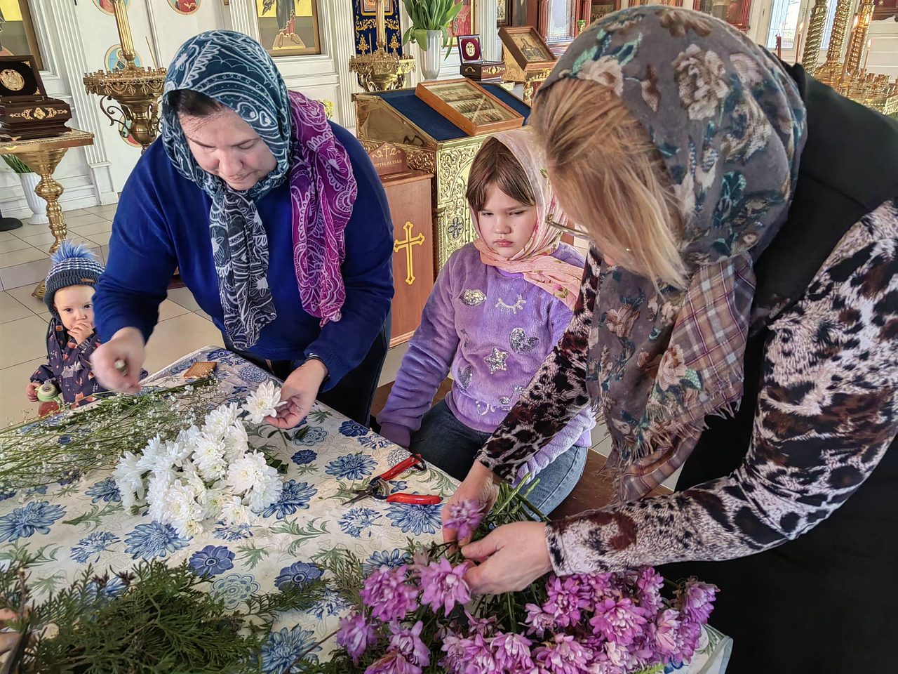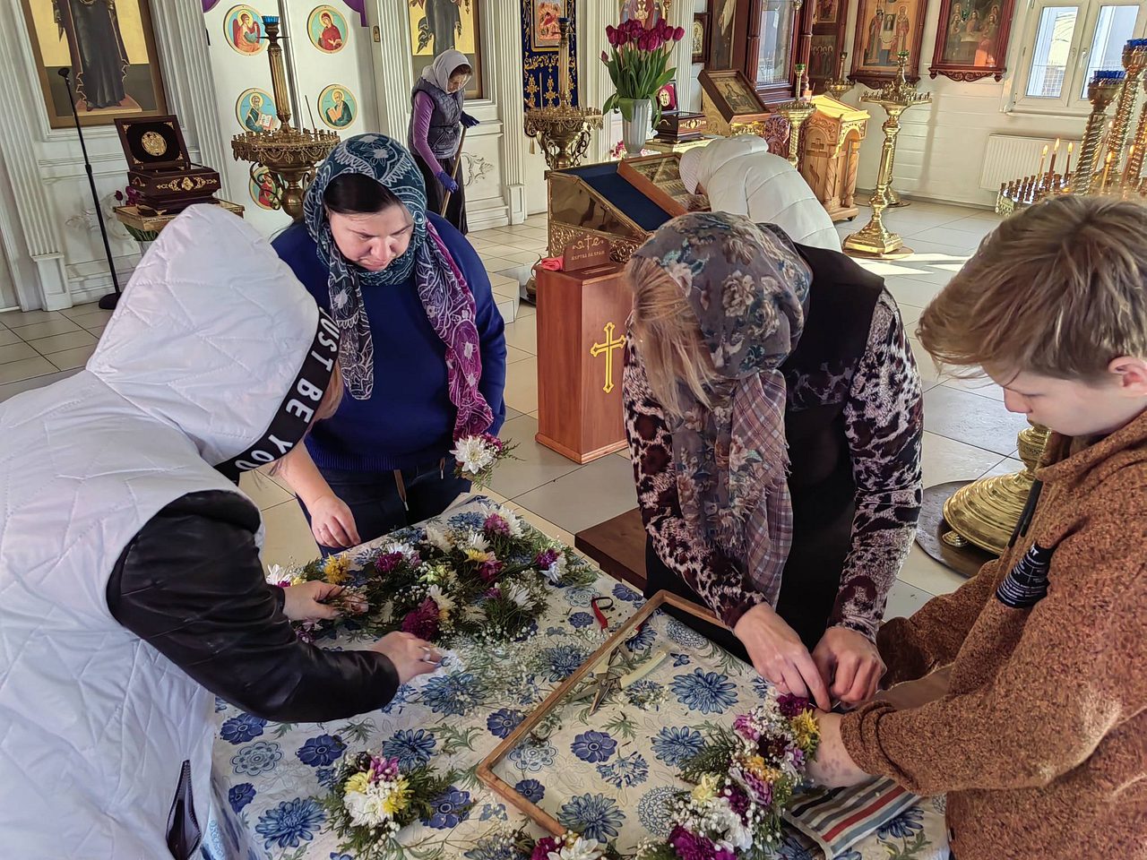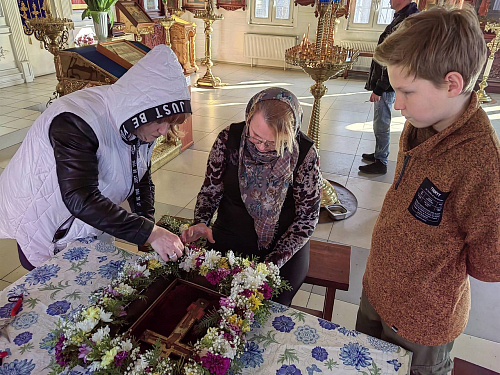 После совместной молитвы, под руководством Хрящевой Натальи, прихожане и и флориста храма ребята с родителями разбирали цветы, учились составлять из них букетики и украшали ими крест.