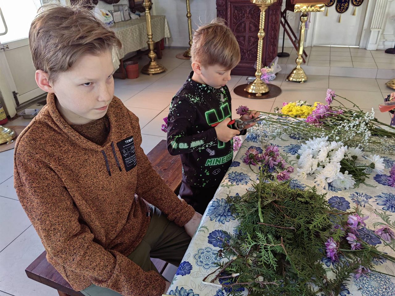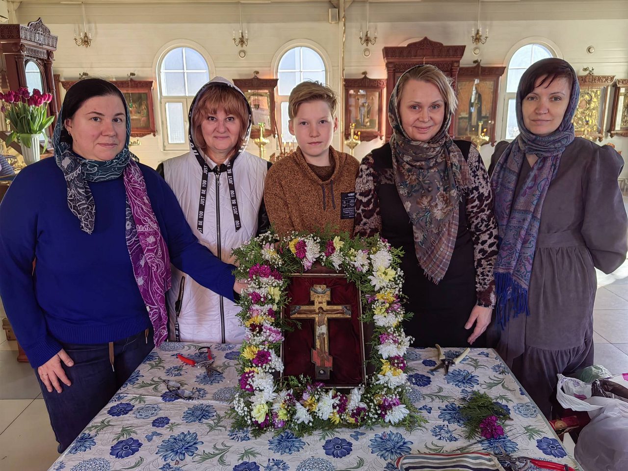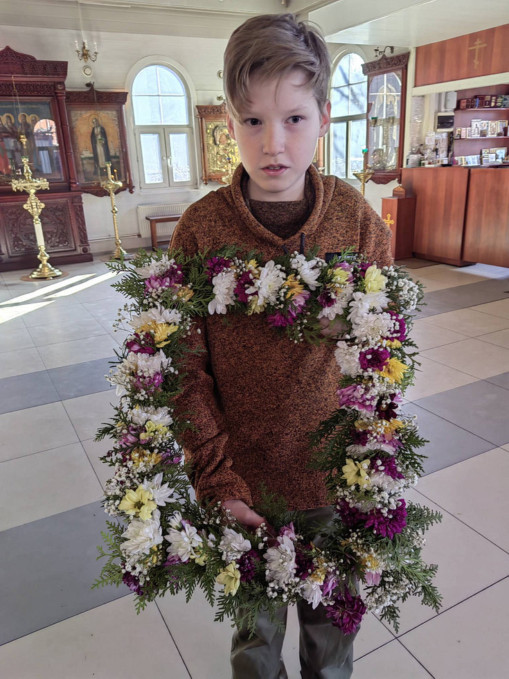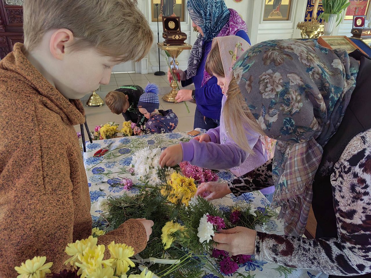 После совместной молитвы, под руководством Хрящевой Натальи, прихожане и и флориста храма ребята с родителями разбирали цветы, учились составлять из них букетики и украшали ими крест.