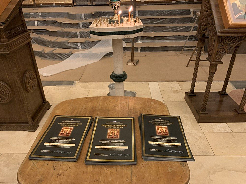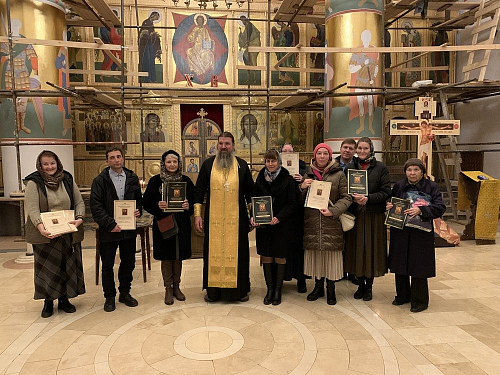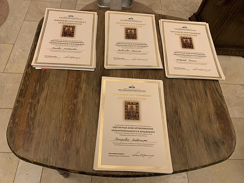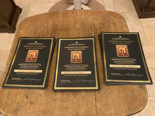 В завершение состоялось торжественное вручение именных сертификатов прихожанам, которые приняли участие в написании икон Святителя Луки, архиепископа Симферопольского и Крымского, и Патриарха Московского и всея Руси Ермогена, для иконостаса основного храма.