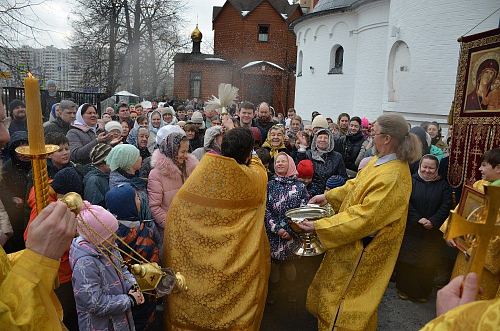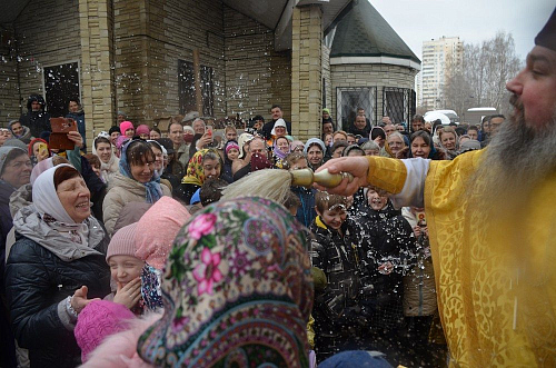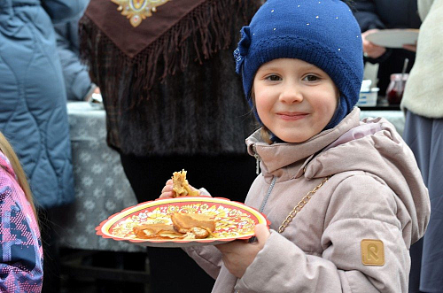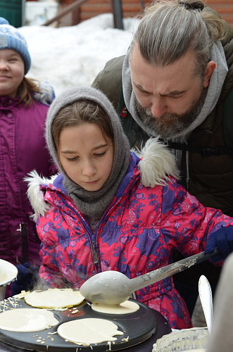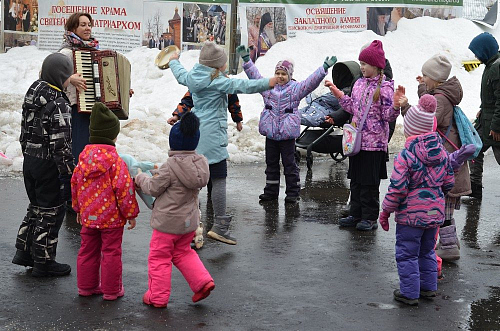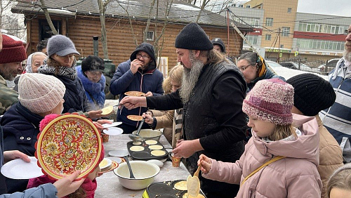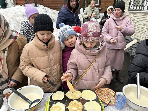 По окончании богослужений на территории храма для всех присутствующих состоялась праздничная трапеза - блины со сметаной, вареньем и сгущенкой, без которых не обходится ни одна масленица, и традиционный вкусный чай со сладостями. Также был организован мастер-класс по выпеканию блинов, в котором активно участвовали воспитанники Воскресной школы храма. Для детей младшей группы Воскресной школы проведены масленичные гулянья - под аккомпанемент аккордеона дети водили хороводы, принимали участие в настольных и подвижных играх.