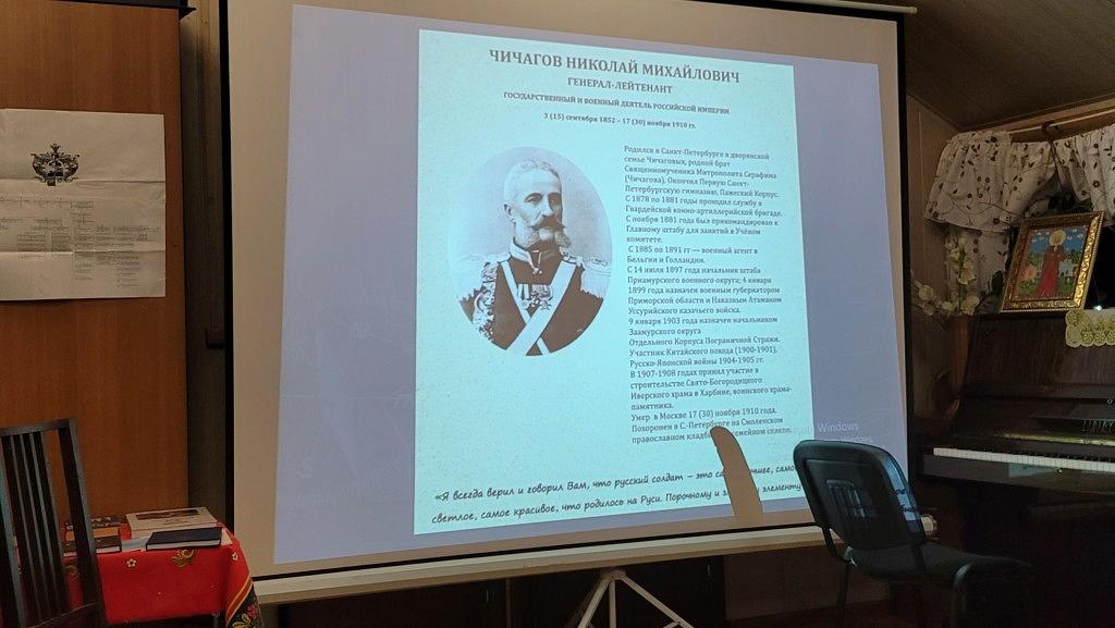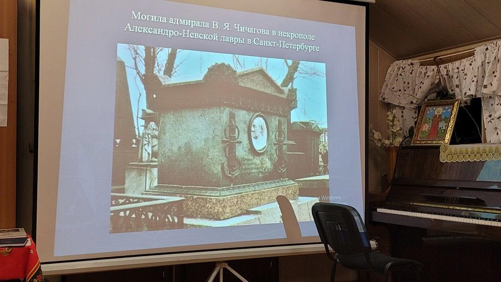 Также на мероприятии были подняты Военно-Патриотические темы. С докладом о славных воинах из рода Чичаговых выступил Левушкин Владимир Анатольевич. Он рассказал о всех подвигах, военном искусстве побеждать врага на море и на суше. Так 26 июля 1789 года 25 кораблей русского флота под командованием адмирала Василия Чичагова сошлись в бою у острова Эланд с 36-ю кораблями шведского флота, которыми руководил герцог Карл Седерманландский. Многочасовое сражение завершилось отступлением шведов, которые не смогли одолеть оборонительные построения Чичагова.