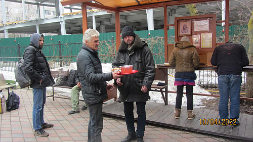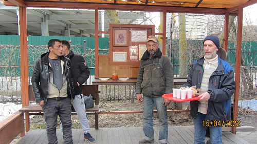 В праздник Светлого Христова Воскресения,в ночь с 23 апреля на 24 апреля 2022 года, по окончании Божественной литургии, социальной службой храма,по сложившейся традиции,на прилегающей к храмутерриториидля прихожан и гостей храма было организовано угощение. Присутствующие на праздничном Богослужении смогли разговеться картошкой с мясом и чаем, приготовленными на полевой кухне.