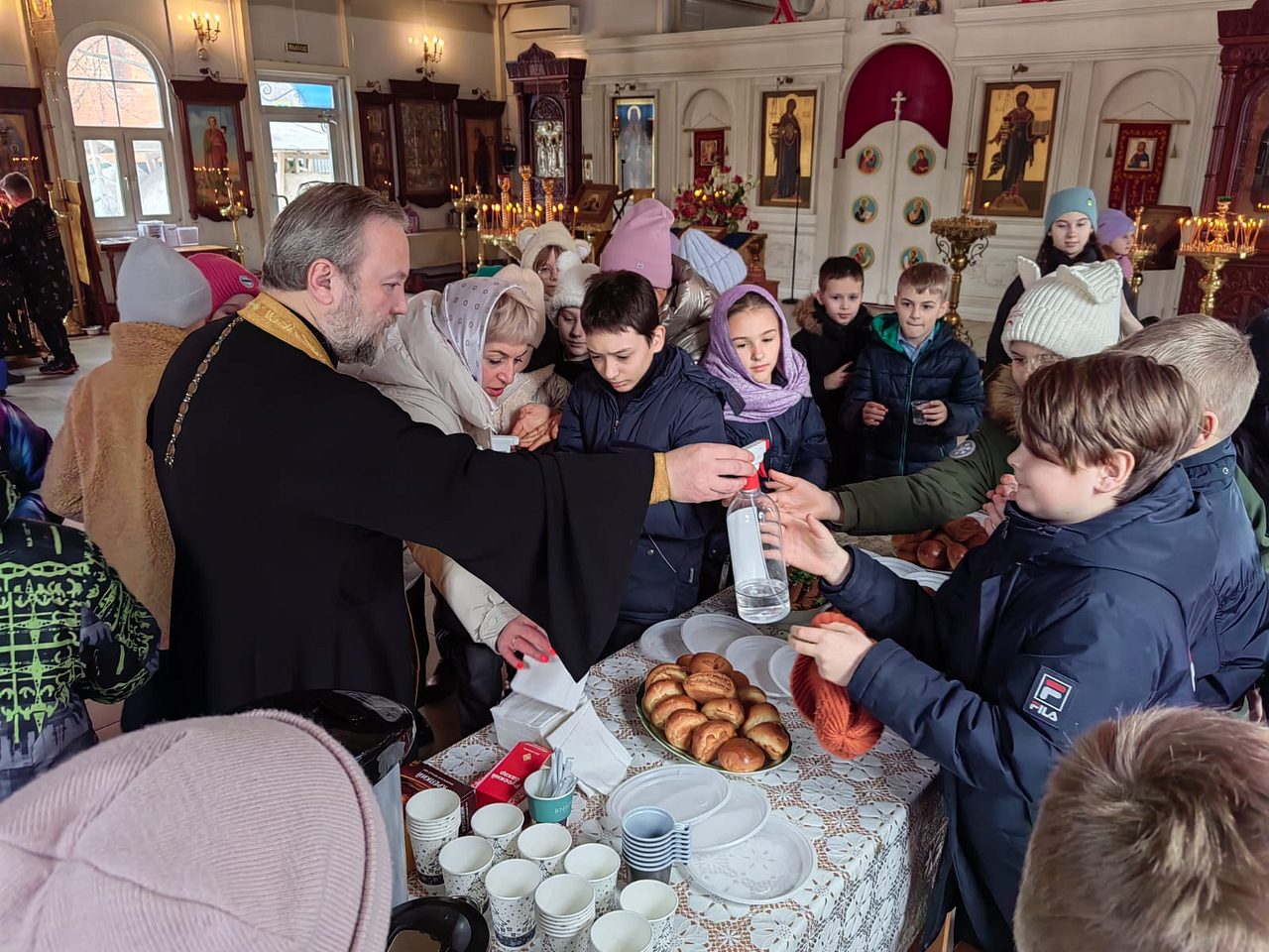 Настоятель храма провел с детьми беседу о Православной вере, о Таинствах Церкви, о святых, изображённых на иконах.