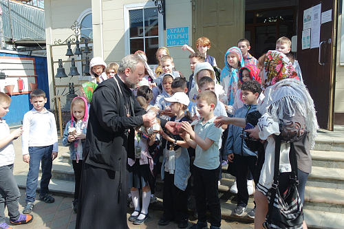 Иерей Максим рассказал детям о Пасхе, Православной вере, о Таинствах Церкви, о святых, изображённых на иконах.