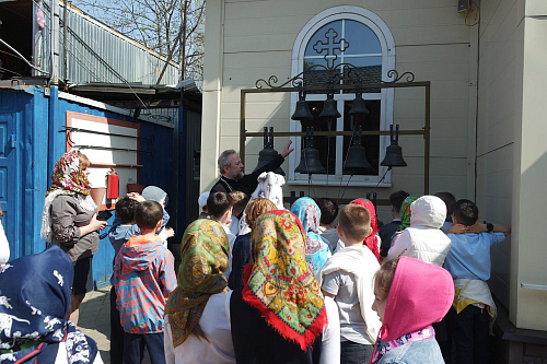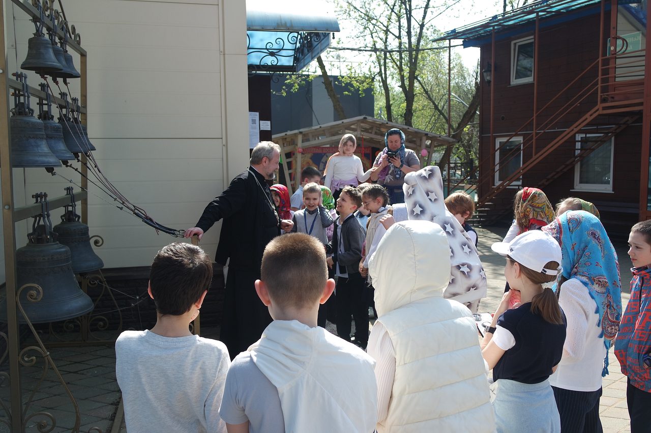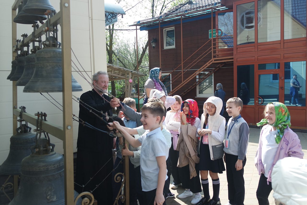 Ребятам смогли попробовать себя в роли звонарей. По старинной православной традиции в дни Пасхальной недели позвонить в церковные колокола может каждый желающий.