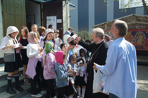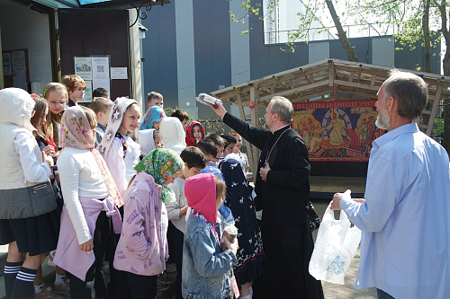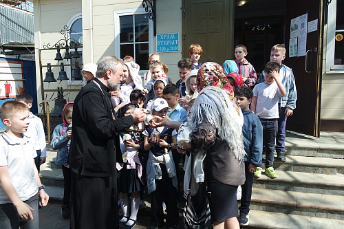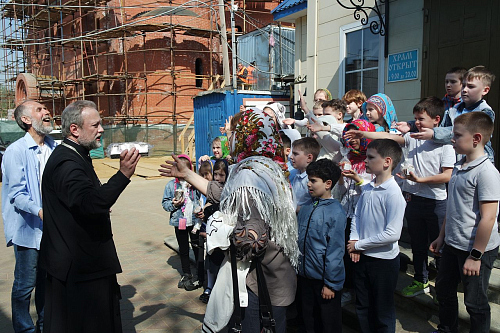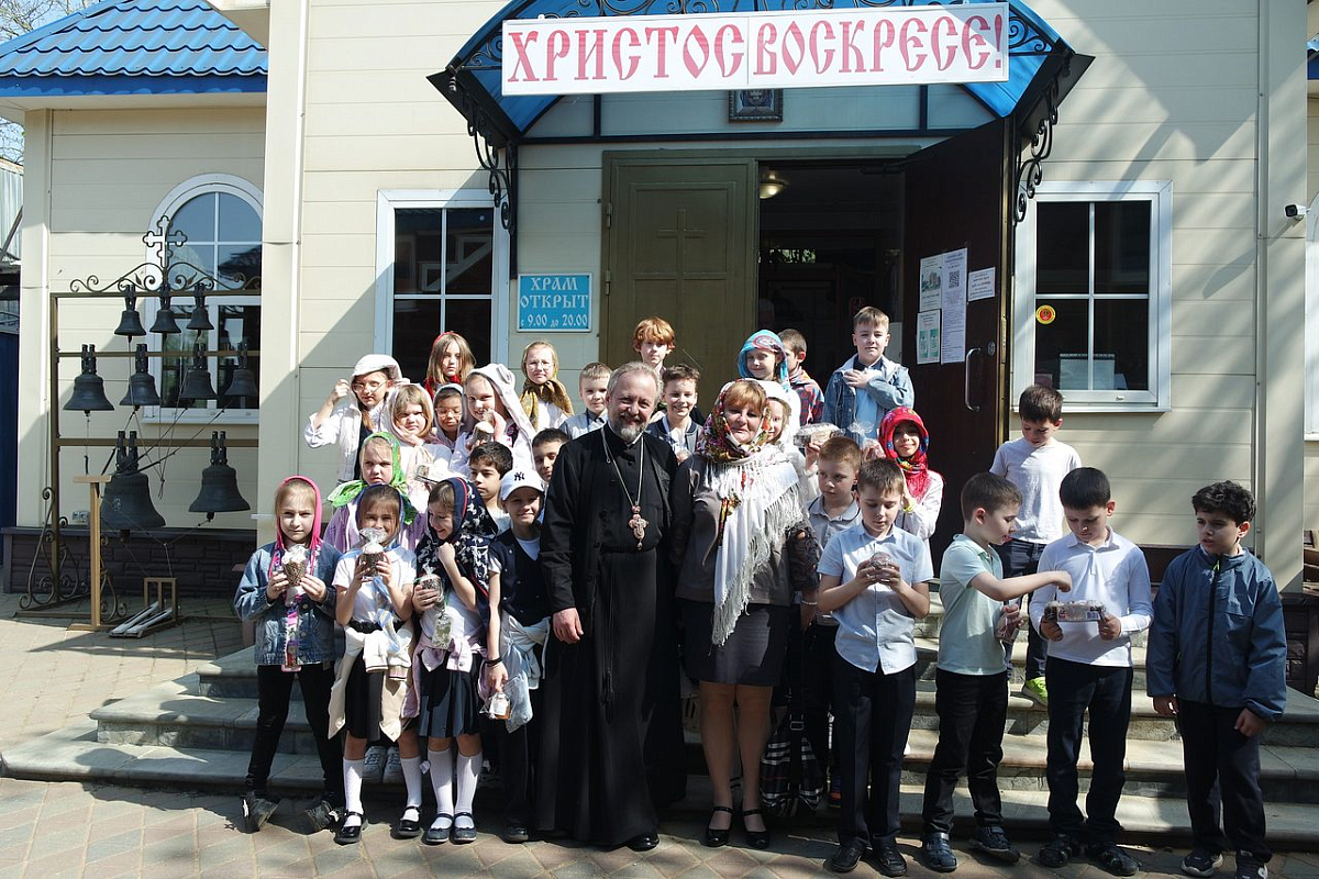 Завершилась экскурсия общей фотографией на память об экскурсии. Настоятель подарил детям пасхальные куличики.
