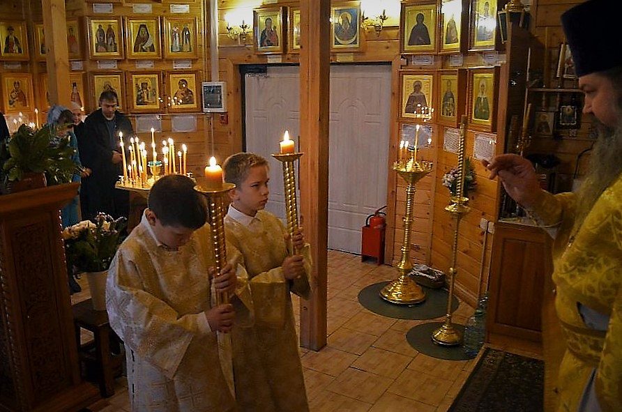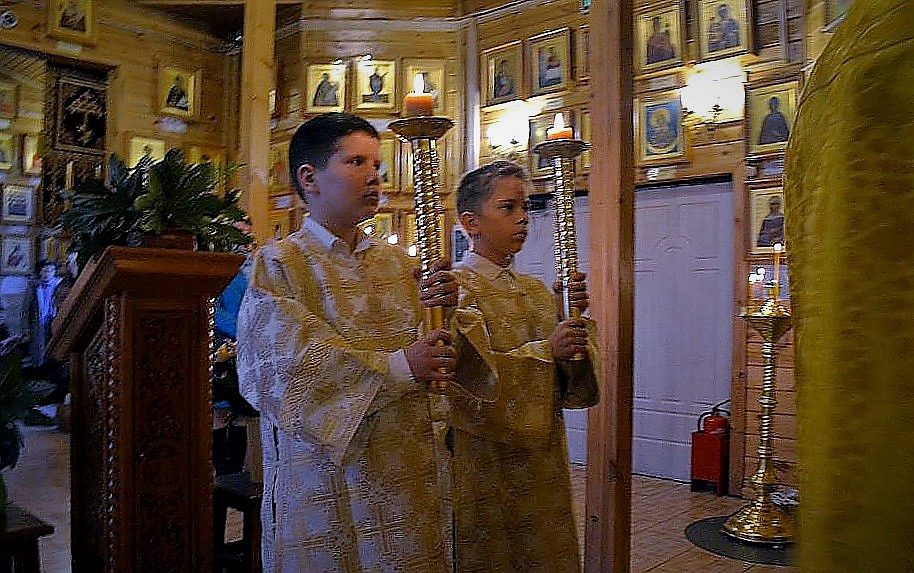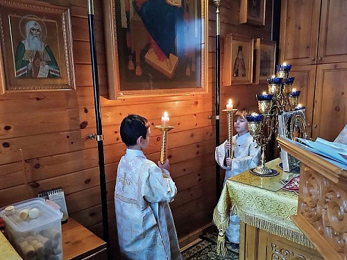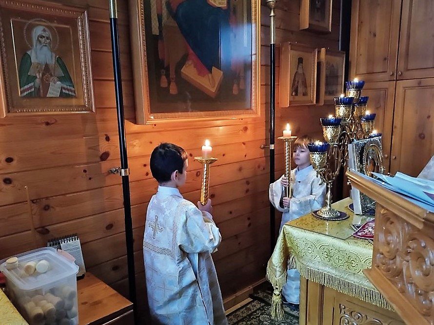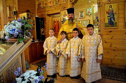 Наиболее отличившиеся за время учебы и посещающие храм воспитанники Воскресной школы в белых стихарях впервые участвовали в Божественной литургии в качестве алтарников, помогали настоятелю в алтаре - подавали кадило, стояли со свечами. Дети готовились к этому событию - накануне несколько часов проведя на занятиях с настоятелем и взрослыми алтарниками, и, не смотря на серьезную ответственность, прекрасно справились с волнением.
