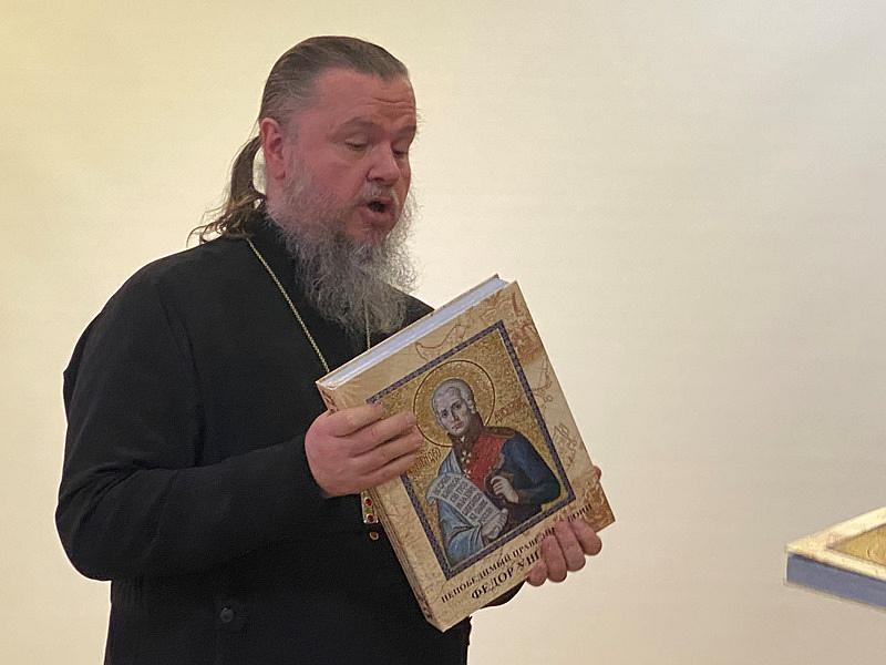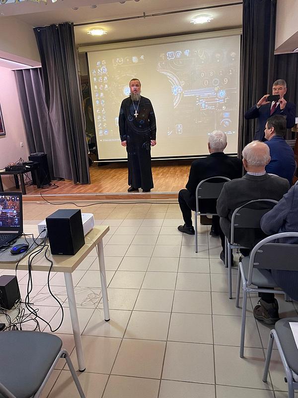 После богослужения игумен Дамиан приветствовал дорогих гостей и рассказал ветеранам и курсантам о личности святого воина Феодора Ушакова, основаниях для его канонизации, 20-летие которой отмечалось в 2021 году. Также настоятель рассказал о строительстве храма Святого адмирала в Южном Бутове, его архитектуре и убранстве. Настоятель отметил, что храм посвящен памяти воинов Органов государственной безопасности, отдавших свои жизни при исполнении своего служебного долга. В храме постоянно совершается молитва обо всех воинах, отмечаются Дни воинской славы, налажены тесные контакты с ветеранскими организациями. Игумен Дамиан показал гостям икону святого великомученика Георгия Победоносца, которую написал своими руками действующий сотрудник Военной Контрразведки, а также величественный образ Пресвятой Богородицы "Державной", которую пожертвовал в храм генерал-майор Юрий Иванович Яровенко.