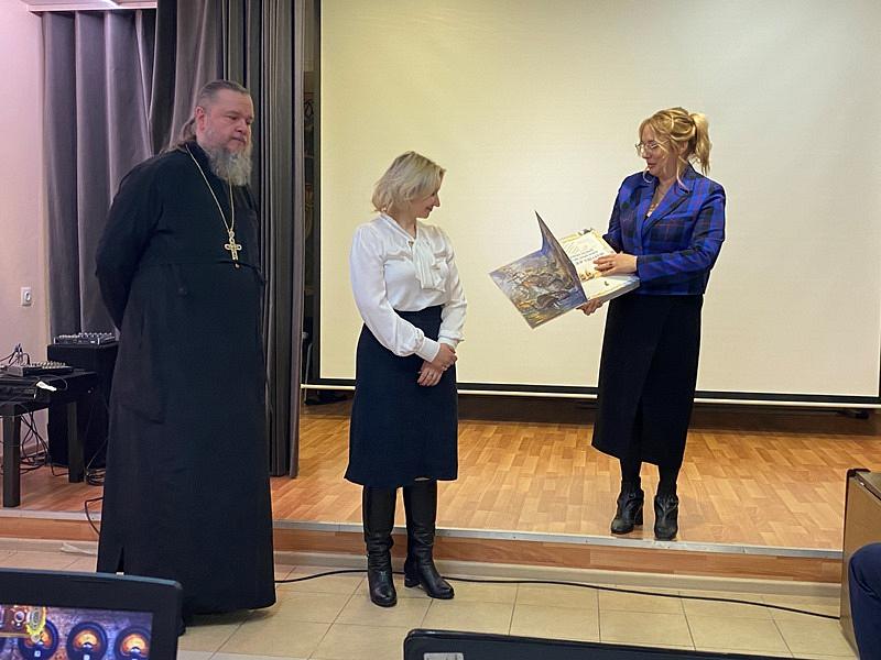 В завершение официальной части Татьяна Михайловна вручила новые замечательные и ценные книги о жизни святого адмирала Феодора Ушакова для храма и Пограничного института с надписаниями автора, Владимира Дмитриевича Овчинникова, капитана 1-го ранга, д.и.н., ведущего научного сотрудника фгквоу во «Военная академия Генерального штаба Вооруженных Сил РФ». Также в Пограничный институт Александр Александрович Новопашин и Анатолий Степанович Терещенко передали много интересных книг о деятельности и героях ВКР ФСБ РФ. Причем авторами этих книг являются настоящие специалисты: доктор исторических наук, профессор, генерал-лейтенант Александр Александрович Зданович и полковник Анатолий Степанович Терещенко. Анатолий Степанович Терещенко, член Союза писателей России, полковник запаса, почётный сотрудник госбезопасности, один из непосредственных организаторов и участник многих оперативных разработок, прослуживший в центральном аппарате 3-го Главного управления КГБ СССР около двадцати лет. Написал более сотни публицистических статей в журналах и газетах.