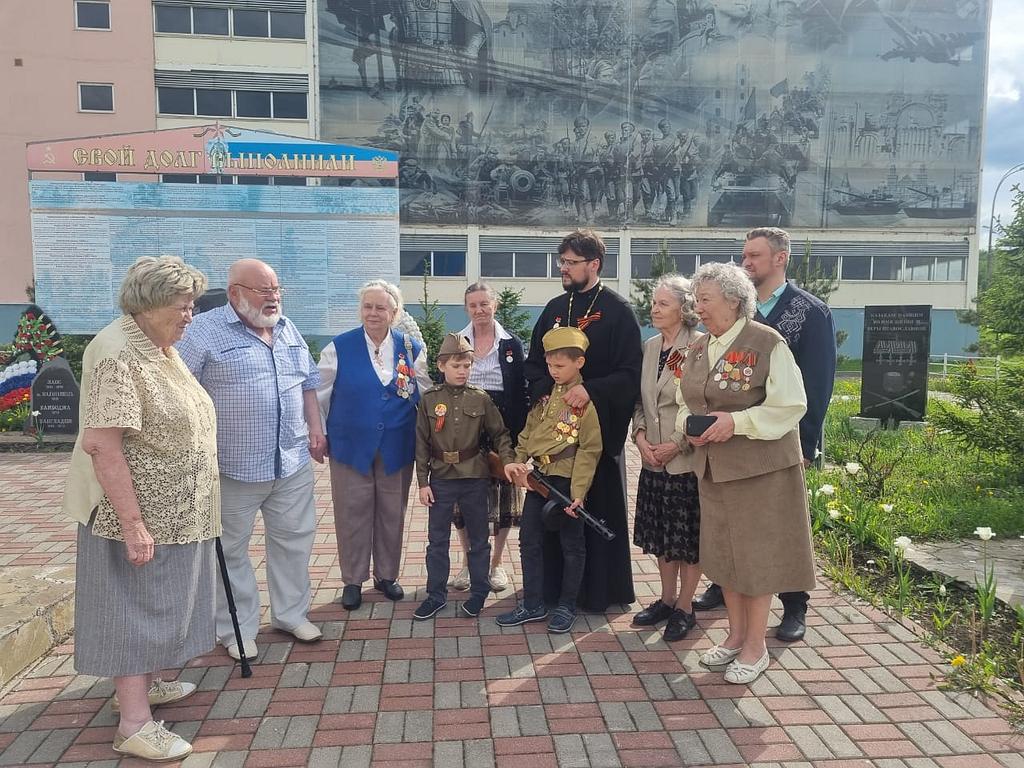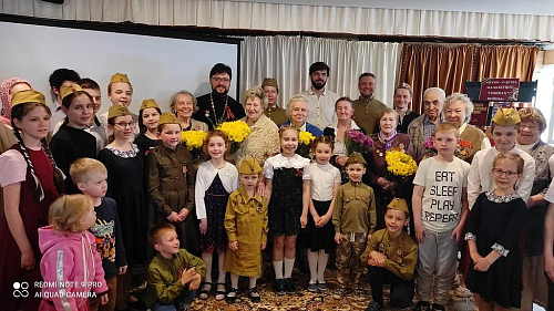 По окончании памятной встречи иерей Илия Власов вручил всем почетным гостям-ветеранам открытки и подарочные продуктовые наборы, а учащиеся Воскресной группы преподнесли букеты весенних цветов.