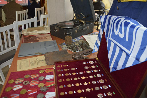 Перед началом встречи, пока гости и участники концерта собирались в помещении Воскресной учебно-воспитательной группы, был организован интерактивный осмотр выставки музейных экспонатов времен Великой Отечественной Войны: офицерской формы, пожелтевших газет, писем с фронта, орденов, медалей, наград, военной атрибутики и оружия.
