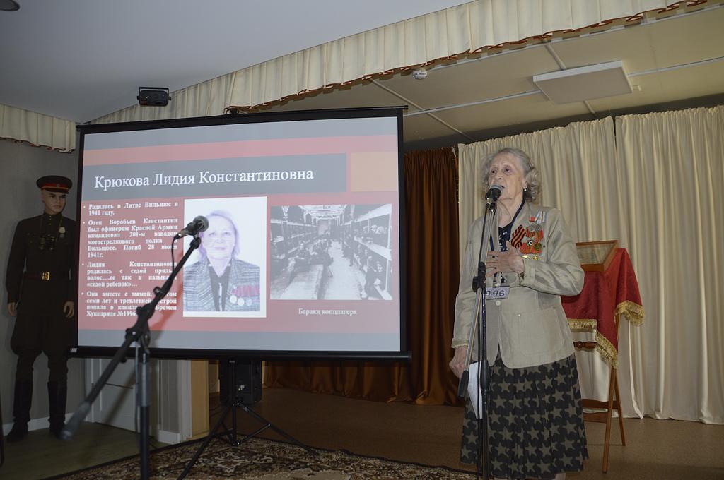 Далее приглашенные ветераны рассказали присутствующим о тех страшных днях детства, которые они провели в застенках фашистских лагерей. И взрослые, и дети слушали с большим вниманием и интересом рассказы уже пожилых малолетних узников. Белозерова Анна Андреевна прочитала несколько очень трогательных стихотворений собственного сочинения, весь зал аплодировал.
