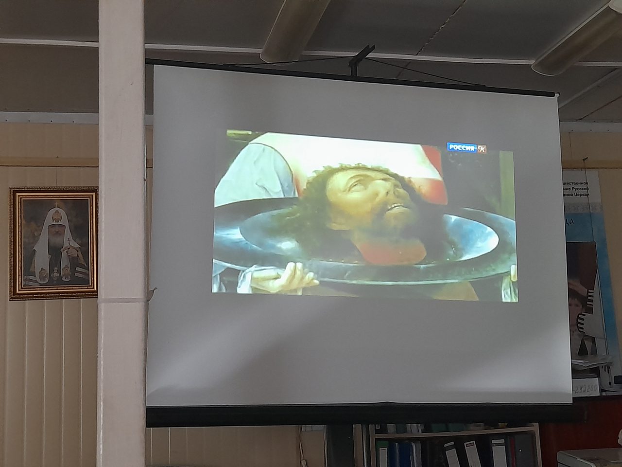 Перед показом ведущий кинолектория, катехизатор храма, Михаил Погорелов вкратце рассказало жизни и мученической кончине святого Пророка Иоанна Предтечи, а также об одной из наиболее почитаемых христианских святынь – его честной главе.