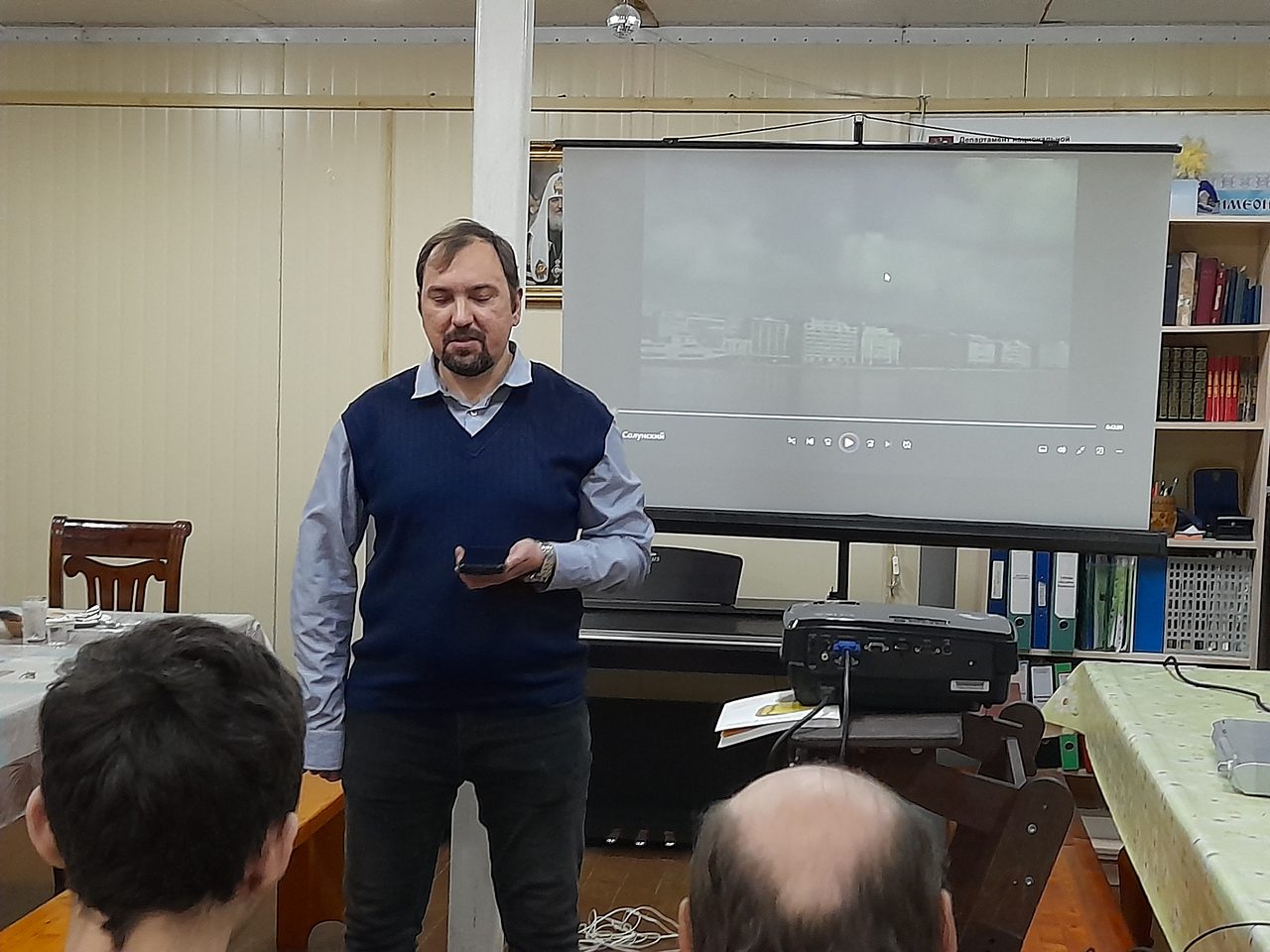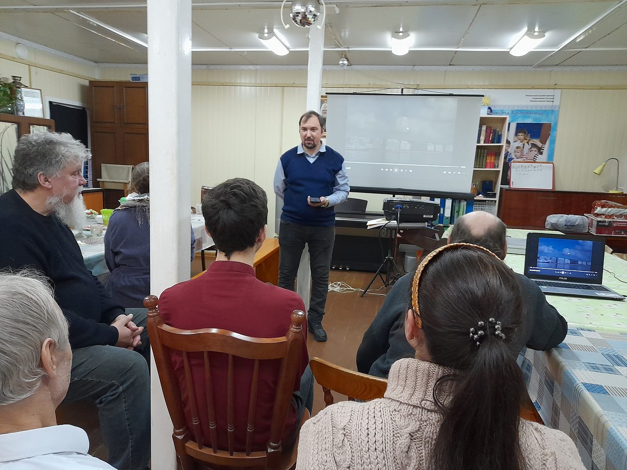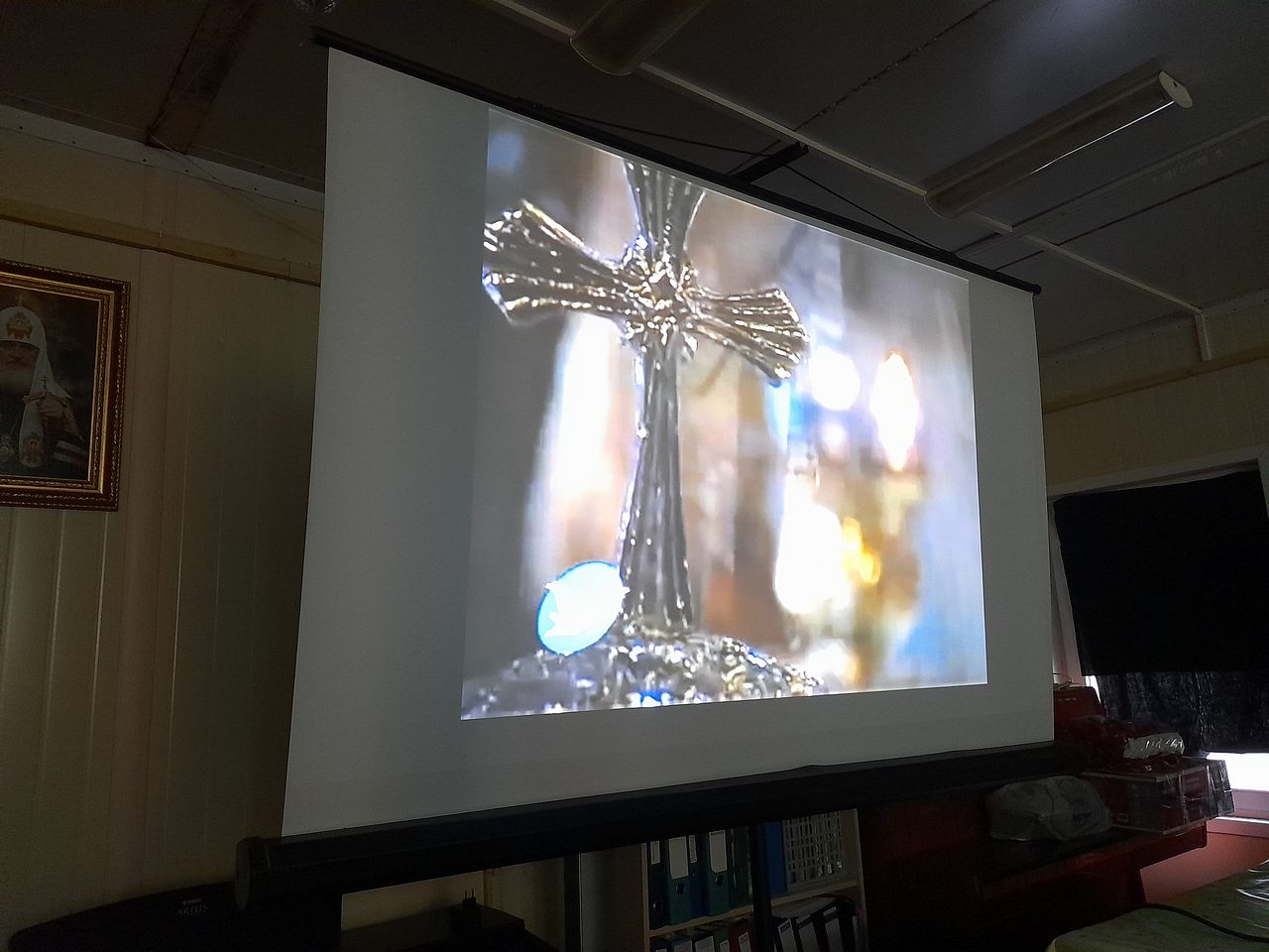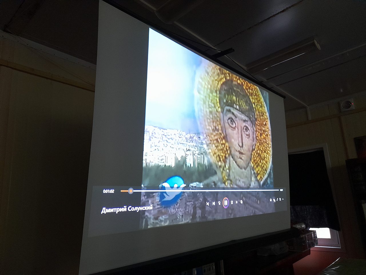 Перед просмотром ведущий кинолектория Михаил Погорелов вкратце рассказал об одном из наиболее почитаемых святых в православном мире, покровителе воинов и города Фессалоники, великомученике Димитрии Солунском.