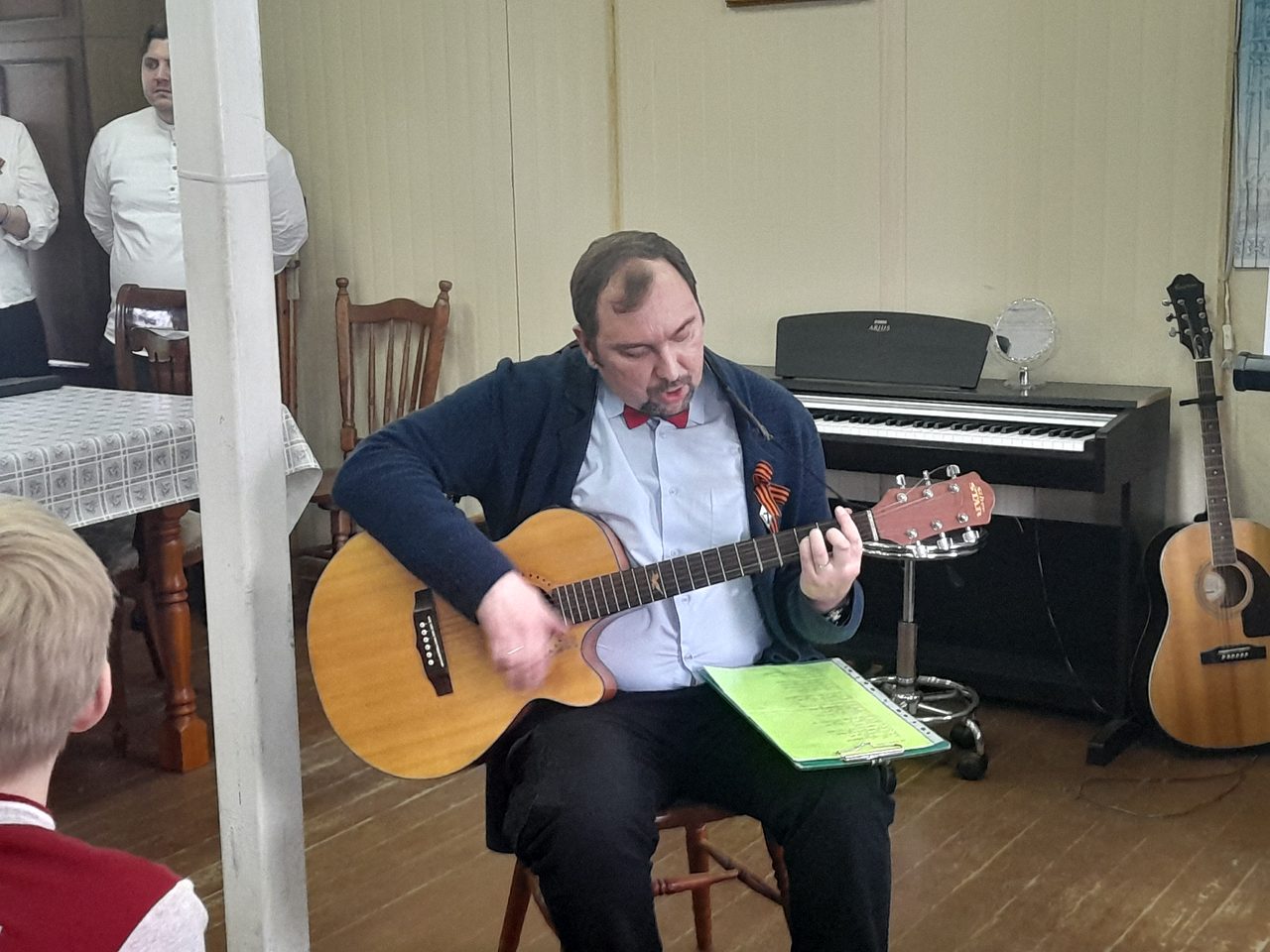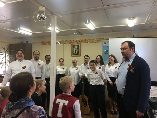 Далее прозвучали песни военных лет в исполнении Молодежного хора храма под аккомпанемент баяна, фортепиано и гитары.