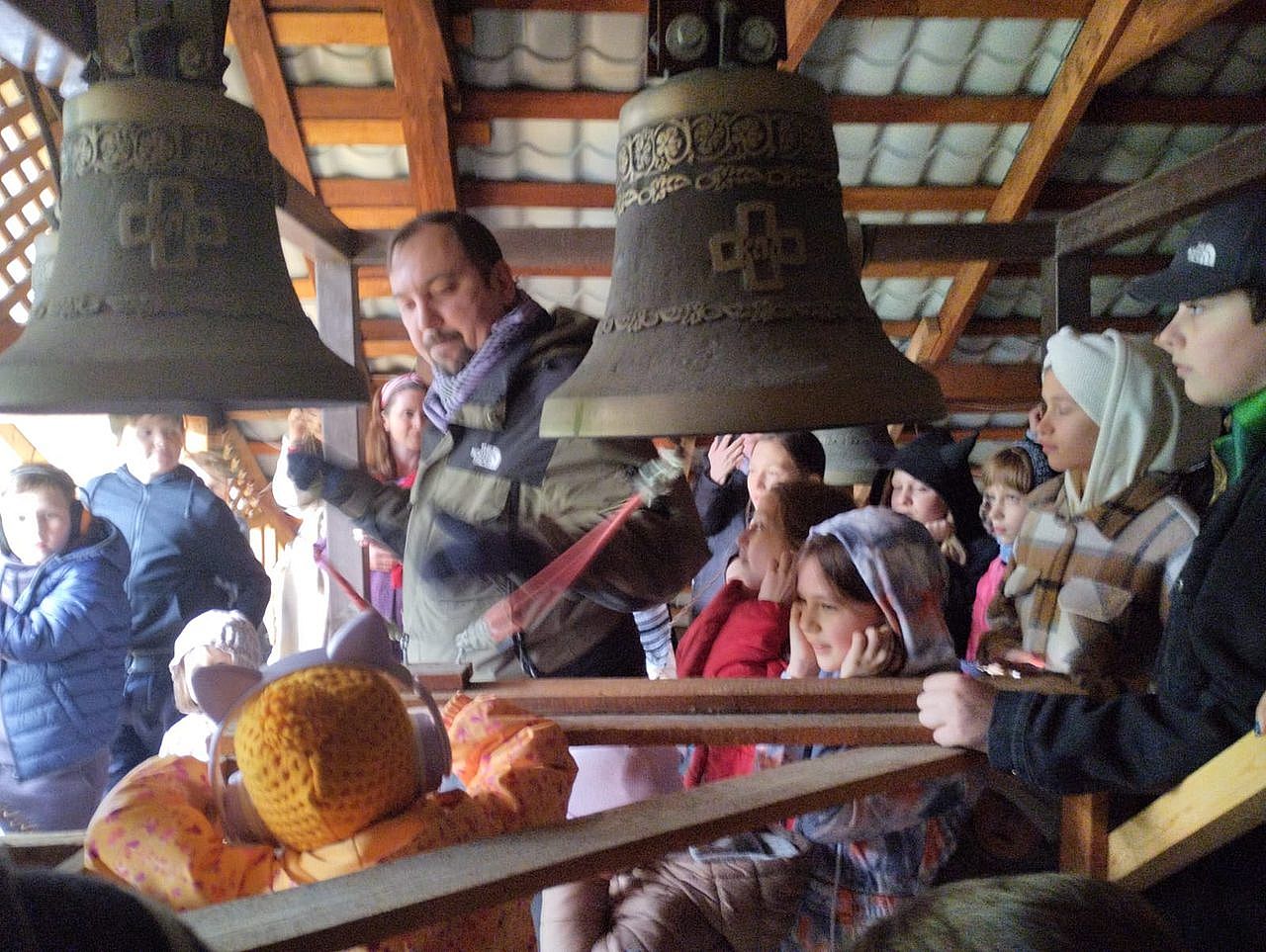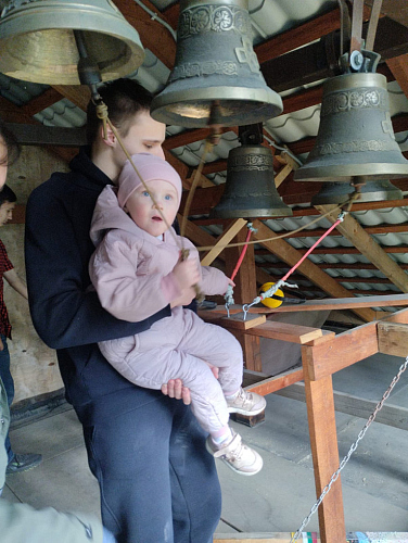 Там детей ждал главный звонарь храма и ведущий фестиваля Михаил Погорелов. Он рассказал ребятам об устройстве колокольни, об истории, технике и особенностях колокольного звона.