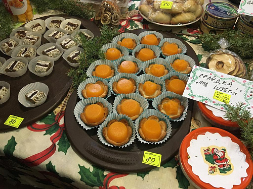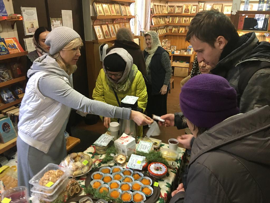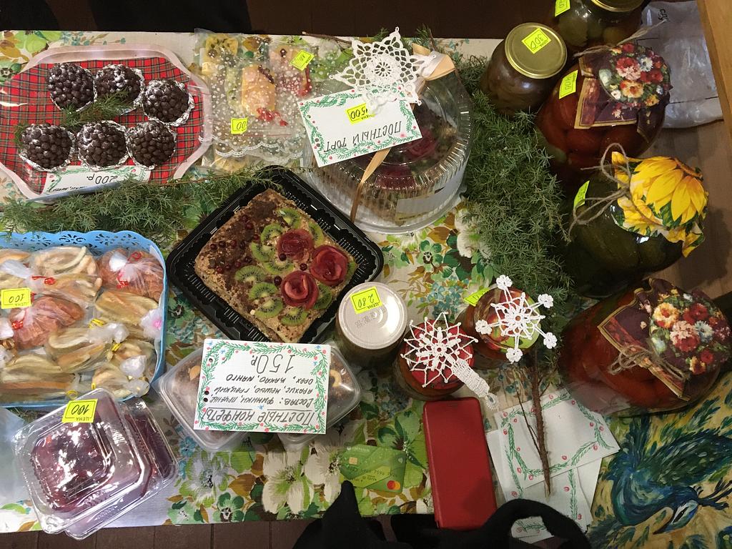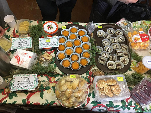 В продаже были представлены рождественские подарки, постные сладости ручной работы, выпечка, соления и прочие товары, изготовленные прихожанами храма и воспитанниками Воскресной школы.