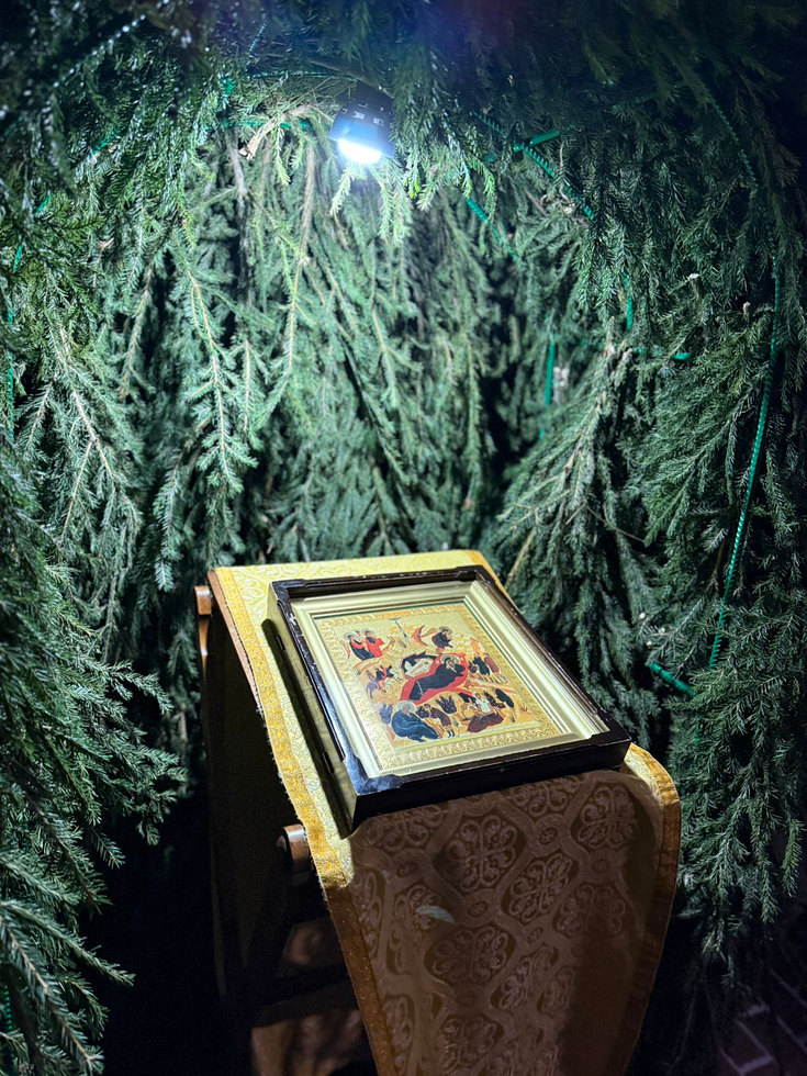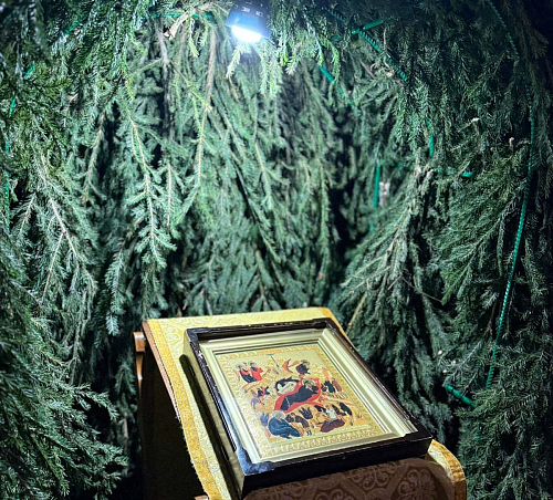 По традиции, дом Божий был убран и украшен, а перед крыльцом установлен вертеп из еловых ветвей с иконой Рождества внутри.