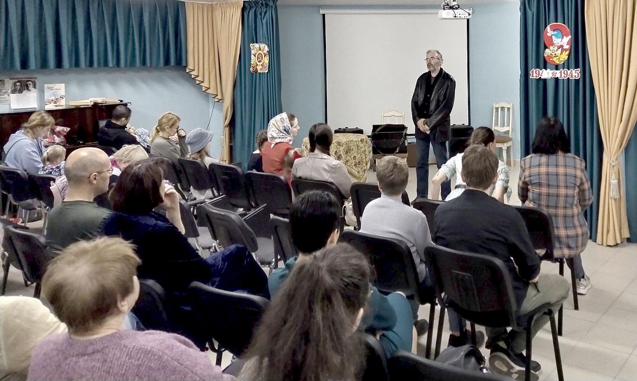 Концерт прошел в конференц-зале школы, украшенной портретами фронтовиков близких и родственников прихожан храма.