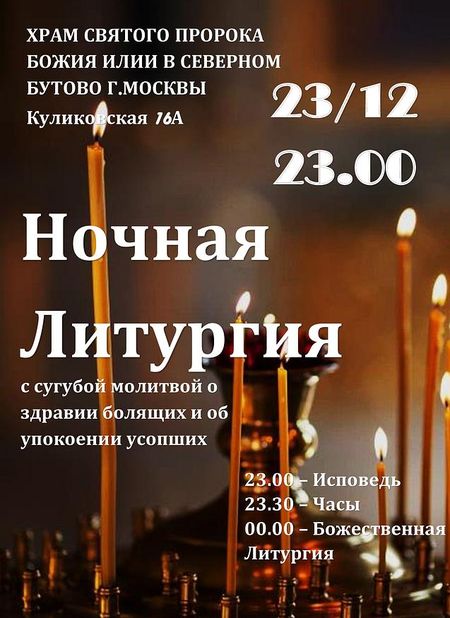 24 декабря 2022 года, в день памяти Преподобного Даниила Столпника, в храме святого пророка Божия Илии в Северном Бутово состояласьночная Божественная Литургия с сугубой молитвой о здравии болящих и об упокоении с выниманием частиц на проскомидии и чтением имён на ектениях после Евангелия.