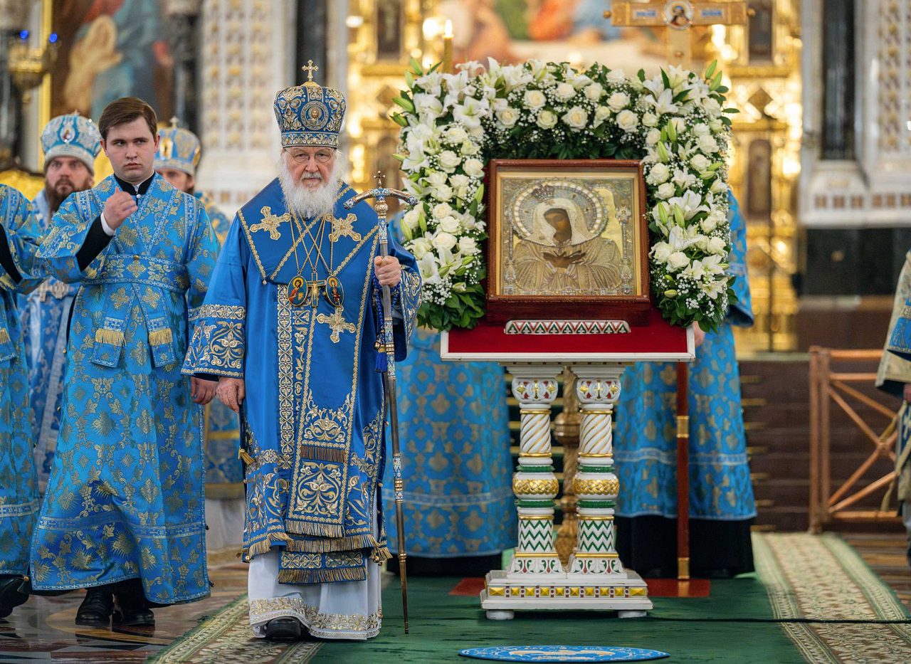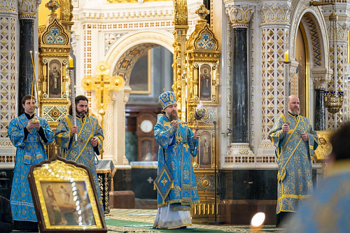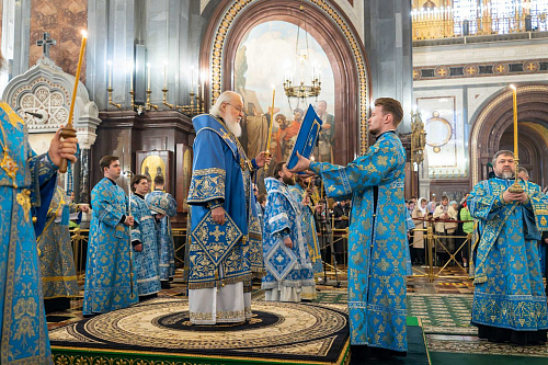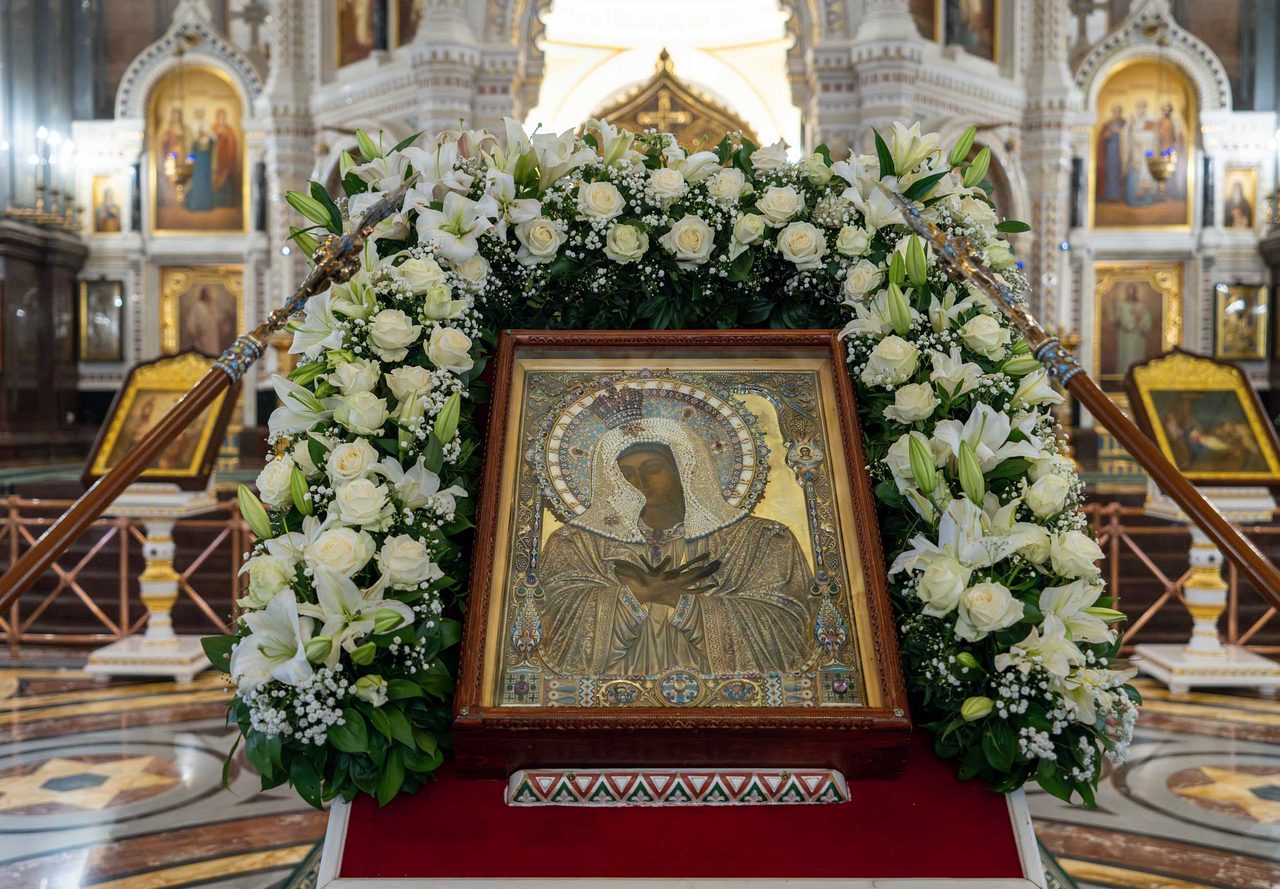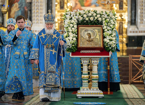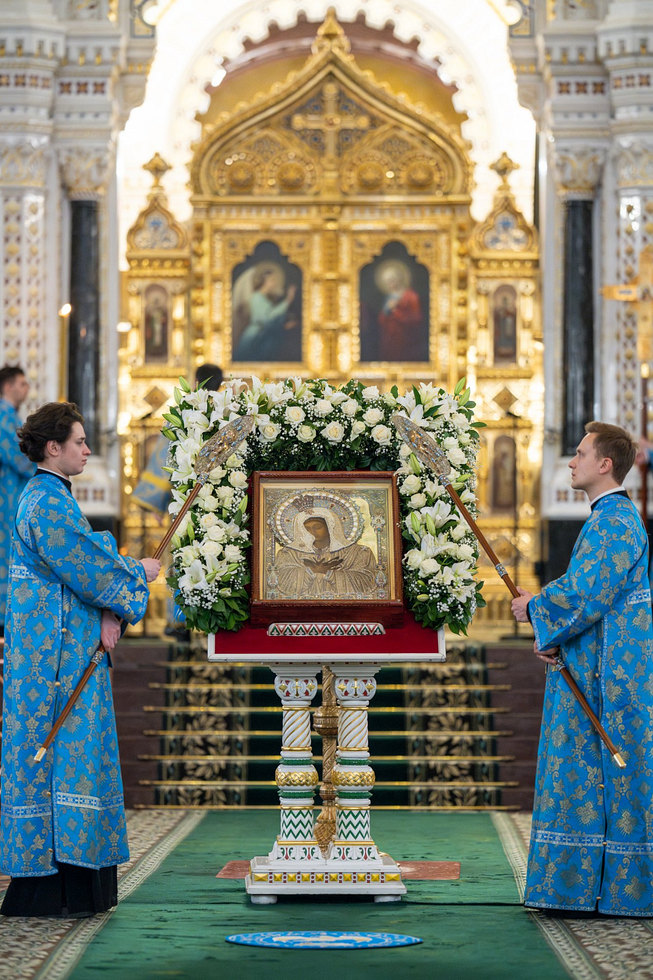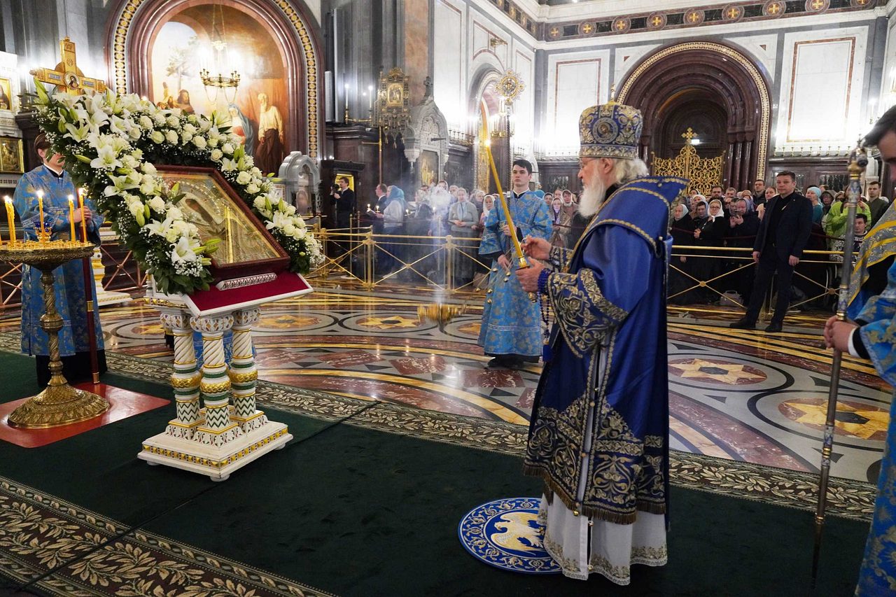 В начале Патриаршего богослужения Серафимо-Дивеевская икона Божией Матери была вынесена из алтаря и установлена на аналое в центре Храма Христа Спасителя.