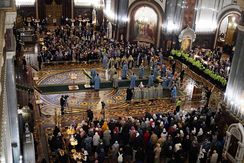 Его Святейшеству сослужили: митрополит Воскресенский Григорий, управляющий делами Московской Патриархии, первый викарий Патриарха Московского и всея Руси по г. Москве; митрополит Звенигородский Арсений; епископ Истринский Серафим, председатель Синодального отдела по делам молодежи; епископ Раменский Алексий, личный секретарь Святейшего Патриарха Кирилла; протоиерей Михаил Рязанцев, ключарь Храма Христа Спасителя; протоиерей Георгий Мартынов, клирик Храма Христа Спасителя; духовенство Храма Христа Спасителя и г. Москвы.