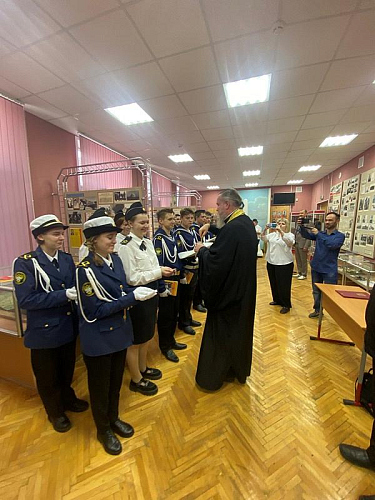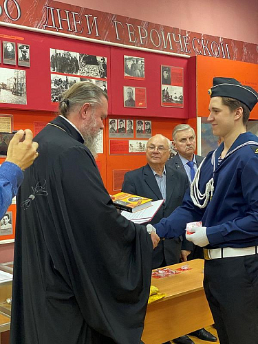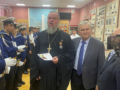 После принесения клятвы перед курсантами выступил настоятель храма святого праведного воина Феодора Ушакова в Южном Бутове игумен Дамиан (Залетов). Настоятель приветствовал курсантов, родителей и воспитателей. Он ободрил ребят и пожелал им стал хорошими и дружными людьми. По доброй традиции игумен Дамиан окропил юнармейцев и всех присутствующих Святой водой и подарил каждому иконку святого праведного воина Феодора Ушакова.