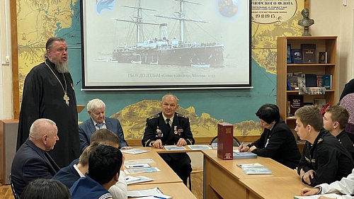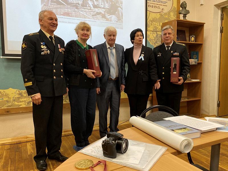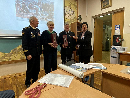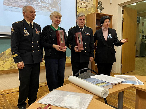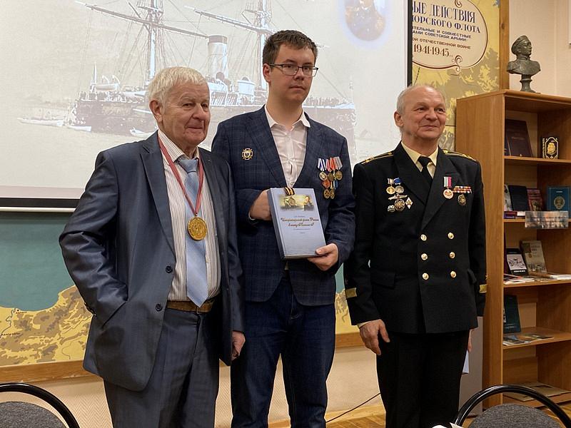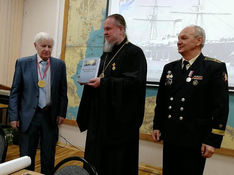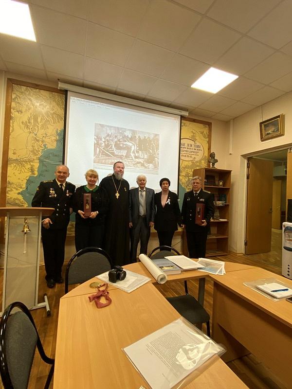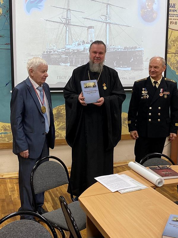 В завершение мероприятия Александр Павлович Нахимов и Анатолий Михайлович Фатеев вручили выступившим на Чтениях ребятам благодарственные письма и книгу Нахимова А.П. «Императорский флот России в эпоху Николая I. Исторические хроники. Книга 1». Также свою книгу Нахимов вручил нескольким присутвующим лицам, наставникам и труженикам патриотической работы, в том числе игумену Дамиану.