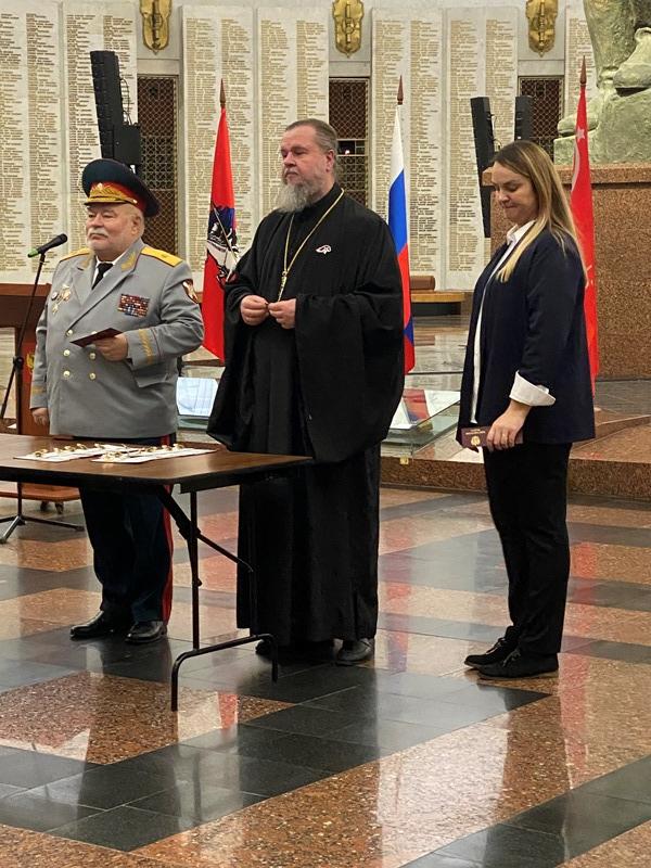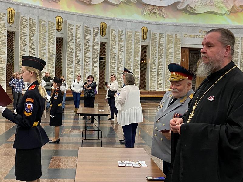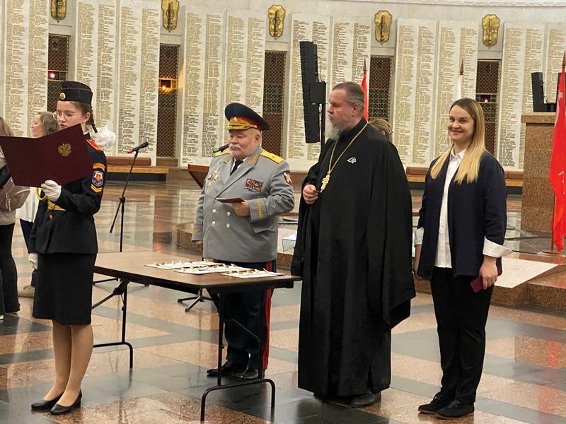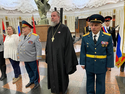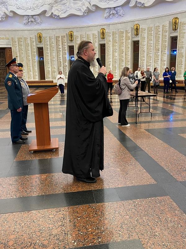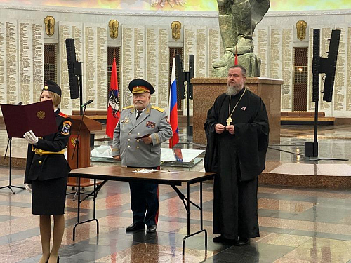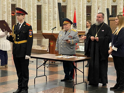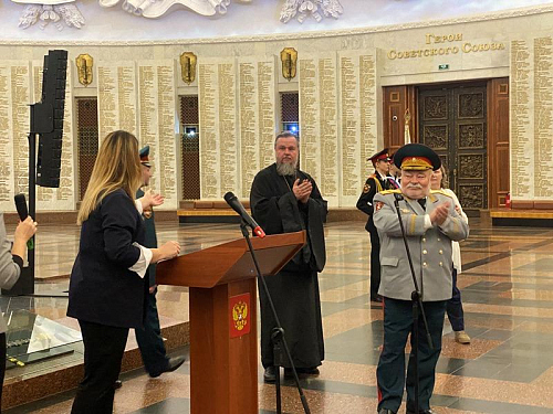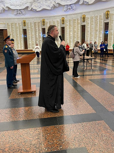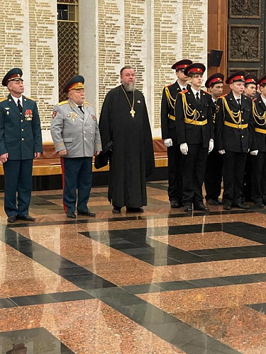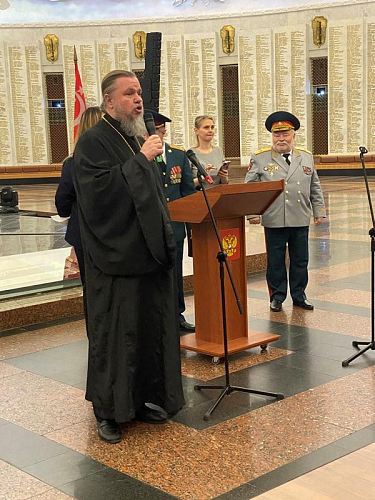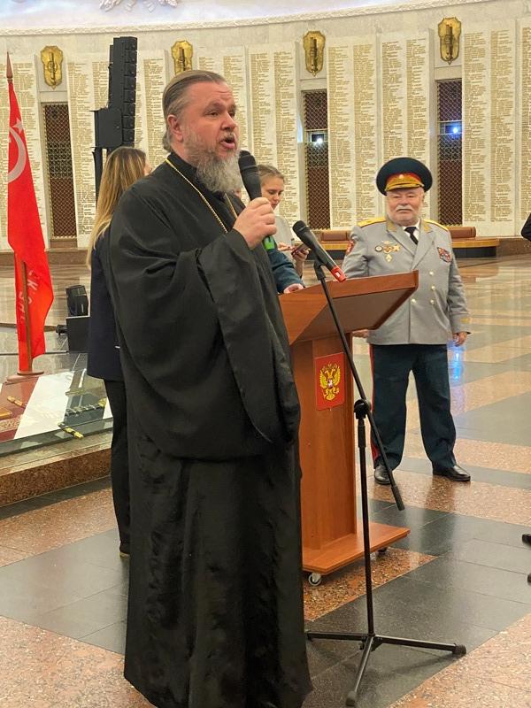 Далее выступил игумен Дамиан (Залетов), который сердечно поздравил новых кадетов с высокой частью быть в рядах юных воинов России. Вместе с тем, он напомнил им и о большой ответственности, которая лежит на них и заключается в неукоснительном следовании словам клятвы, которую они приняли в столь великом месте, где сохраняется память о подвиге наших предков, отдавших жизни в годы Великой Отечественной войны.