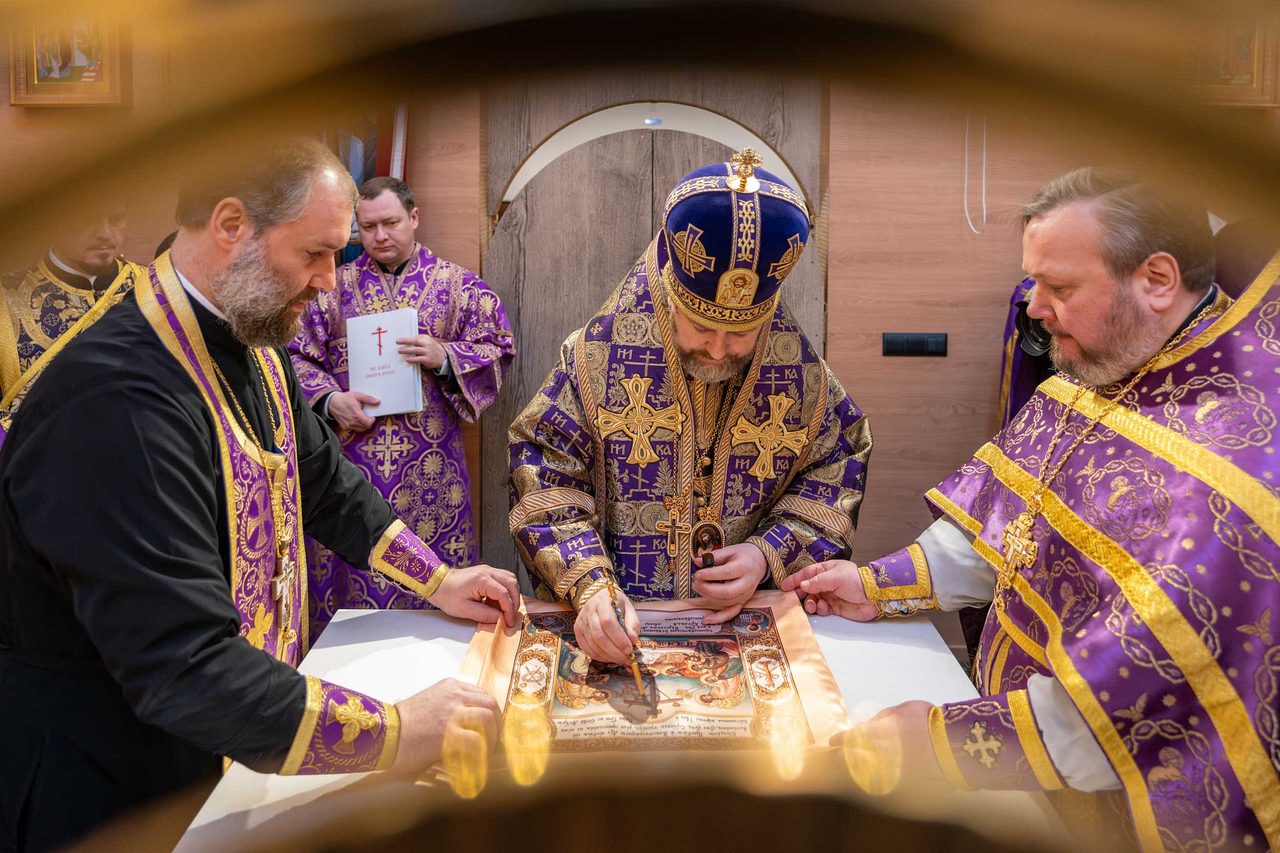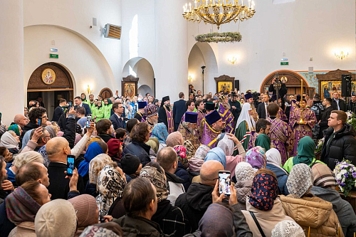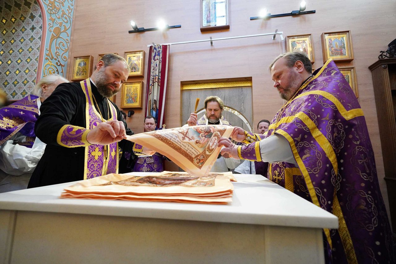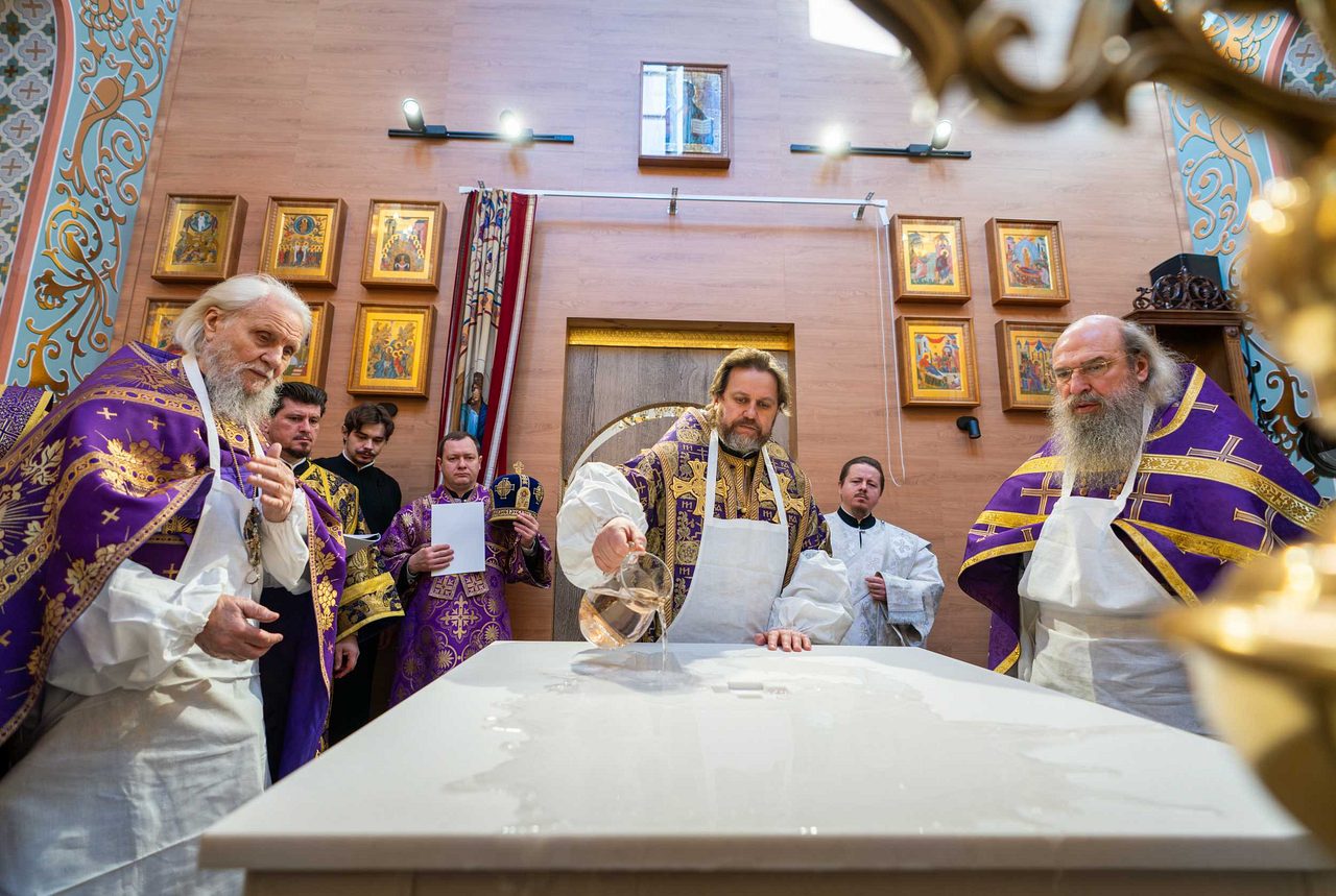 Святейший Патриарх Кирилл освятил два престола: центральный — в честь священномученика Ермогена, южный — в честь преподобного Сергия Радонежского. Также были освящены 20 антиминсов.