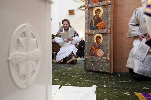 На малом входе указом Святейшего Патриарха Кирилла во внимание к трудам по строительству храма священномученика Ермогена в Зюзине иерей Иоанн Омелянчук был удостоен права ношения палицы.