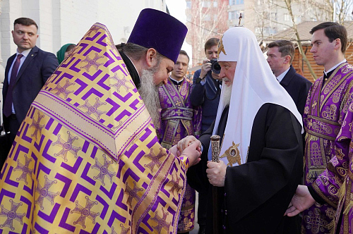 Перед началом богослужения у врат храма Предстоятеля Русской Православной Церкви встречали: протоиерей Николай Карасев, благочинный Андреевского округа, настоятель храма Живоначальной Троицы в Старых Черемушках г. Москвы; иерей Иоанн Омелянчук, настоятель храма священномученика Ермогена в Зюзине г. Москвы.