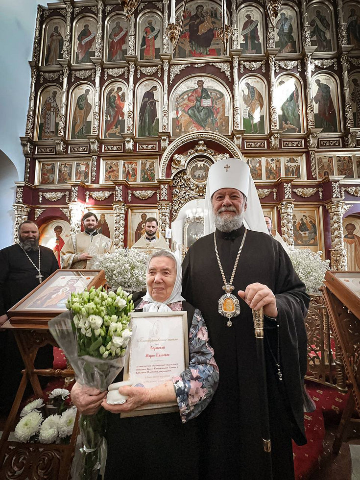 Затем Владыка поздравил прихожанку Борисову Марию Ивановну и вручил благодарственное письмо во внимание за многолетний созидательный труд и помощь храму и в честь 90-летия со Дня Рождения, а также Богослужебную просфору и икону Казанской Божией Матери. Было пропето многолетие.