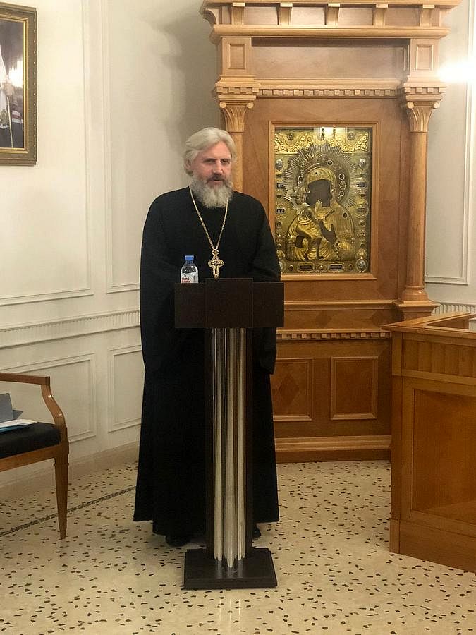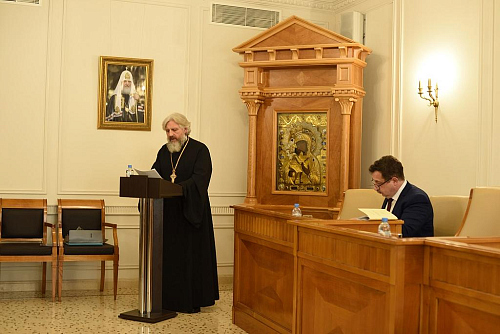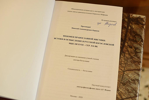 В ходе заседания состоялась защита докторской диссертации благочинного Андреевского церковного округа, настоятеля храма Живоначальной Троицы в Старых Черемушках протоиерея Николая Карасева на тему: «Феномен православной мистики: истоки и осмысление в русской богословской мысли XVIII — сер. XX вв.». Научный консультант диссертанта – доктор философских наук, ведущий научный сотрудник Общецерковной аспирантуры и докторантуры им. святых равноапостольных Кирилла и Мефодия А.Р. Фокин.