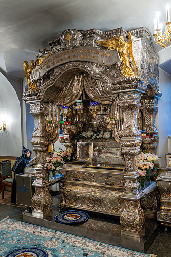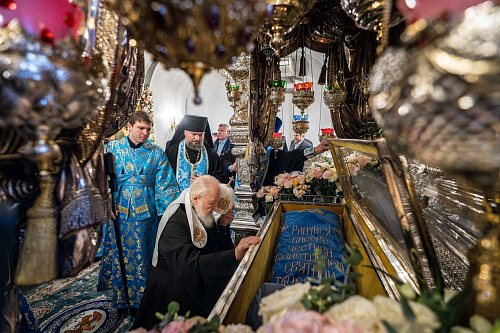 По прибытии в монастырь Святейший Владыка поклонился честным мощам блаженной Матроны, почивающим в нижней церкви храма Покрова Пресвятой Богородицы.