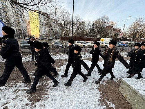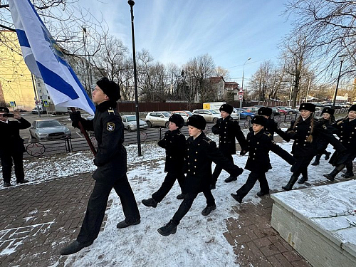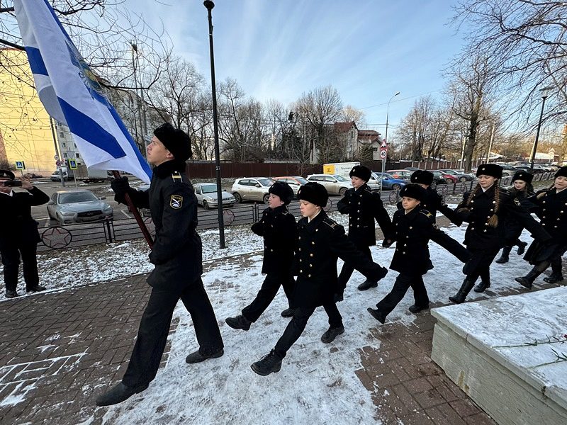 Школьники-кадеты Морской кадетской школы бодро прошли строевым маршем около памятника и гостей.