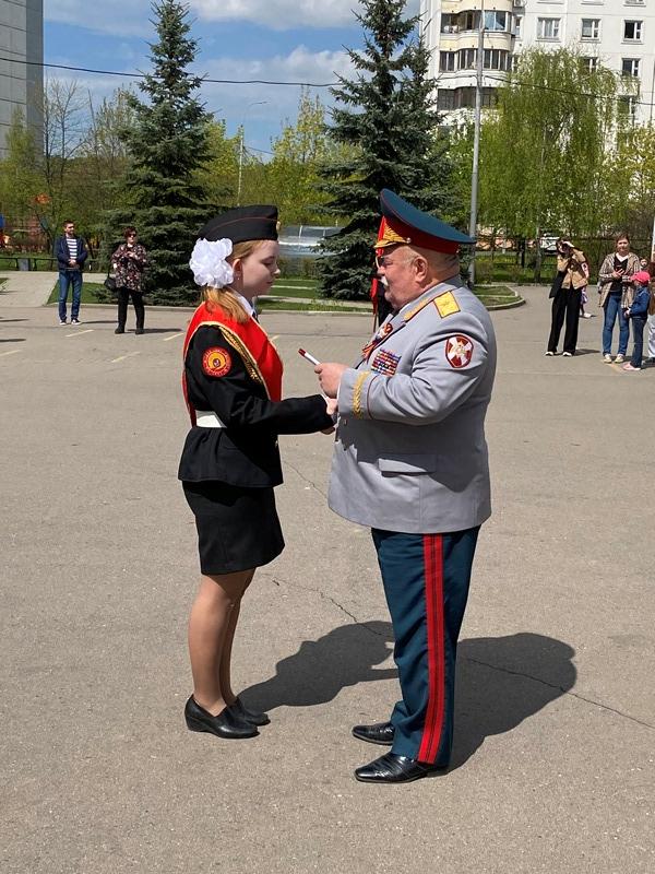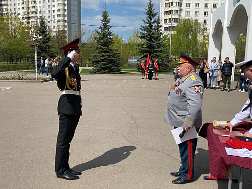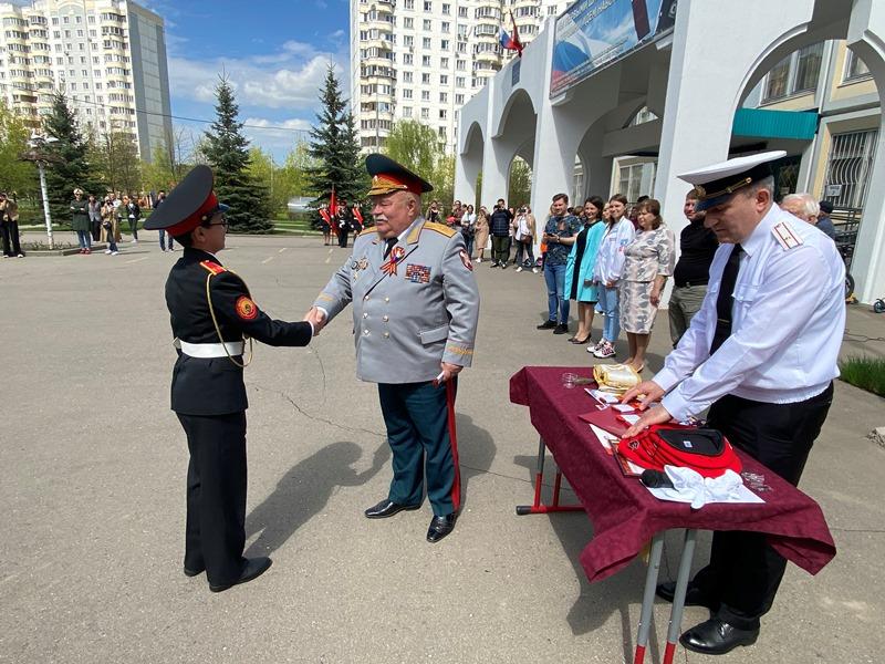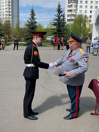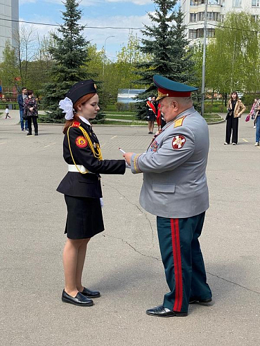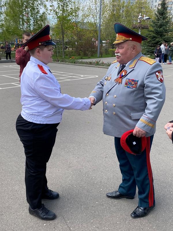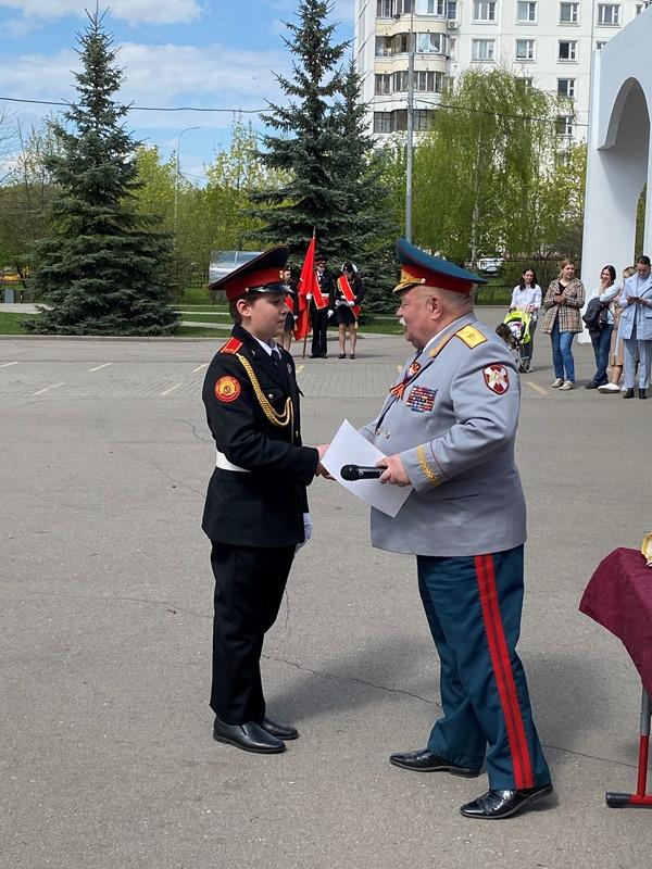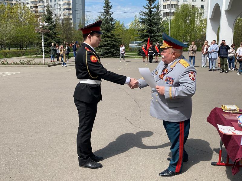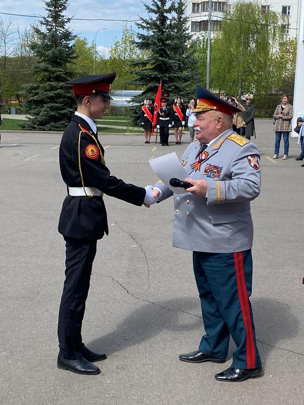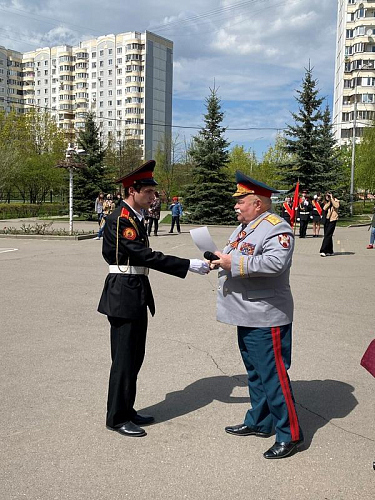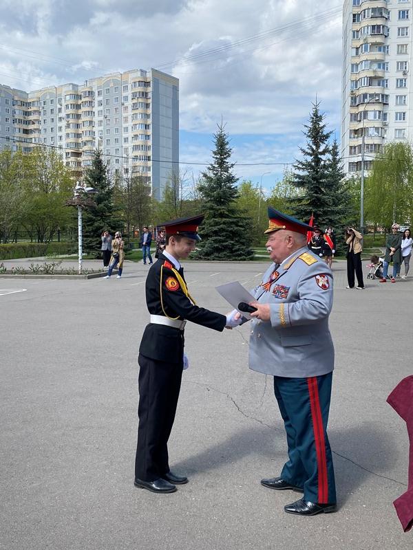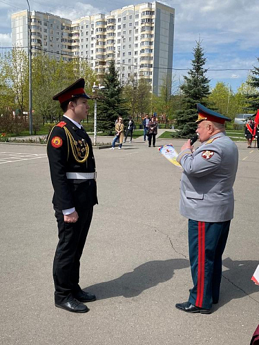 После строевой и музыкальной части Юрий Анатольевич Данченко огласил приказ директора школы 1981 Чермошенцева Александра Викторовича о присвоении некоторым кадетам за отличия и старания очередных кадетских званий, а генерал Николай Николаевич Тутрин вручил отличившимся ребятам погоны и грамоты Совета ветеранов боевых действий, поддержав их добрым словом и напутствием.