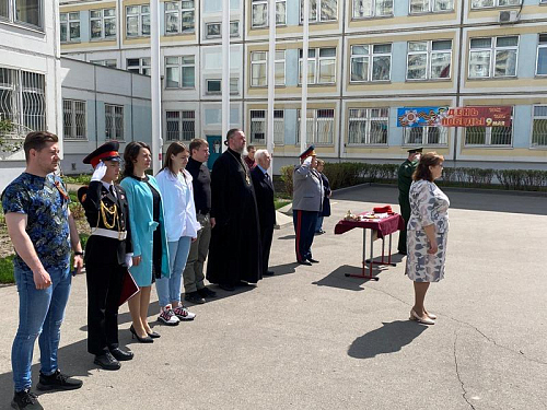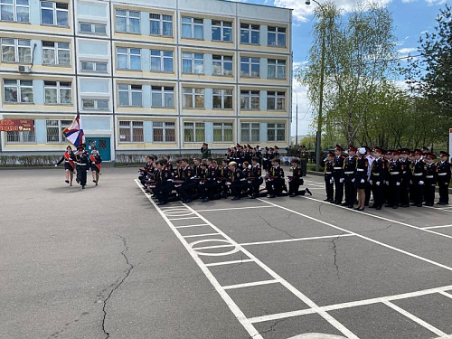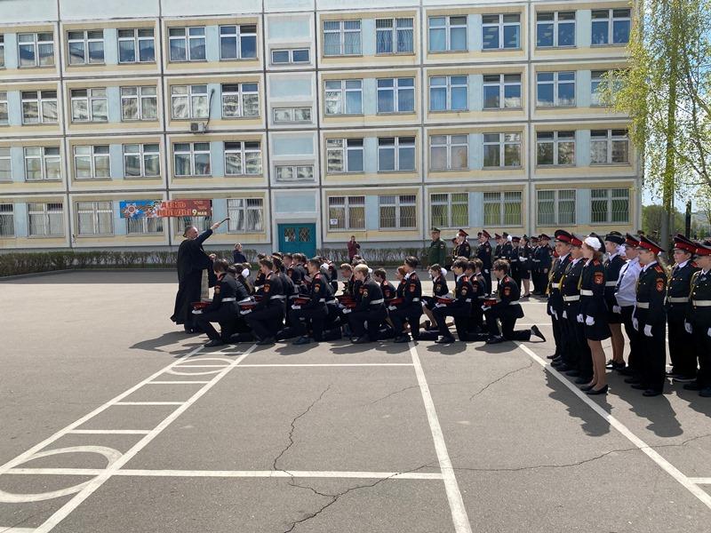После приветствия и поздравлений кадетское школьное знамя было пронесено перед рядами кадетов, которые простились с ним, приклонив колено.