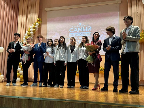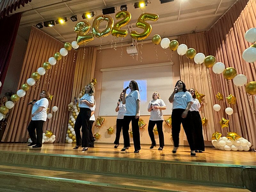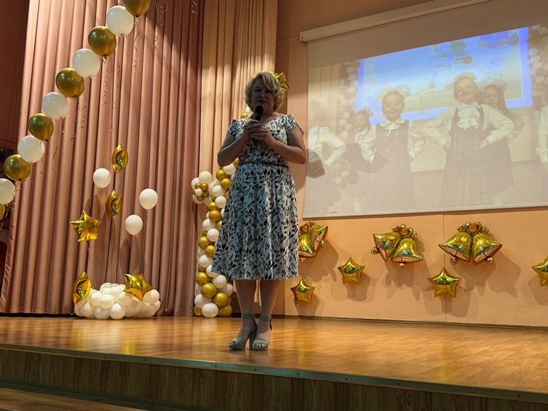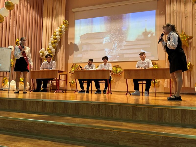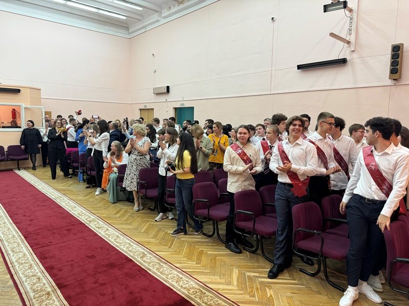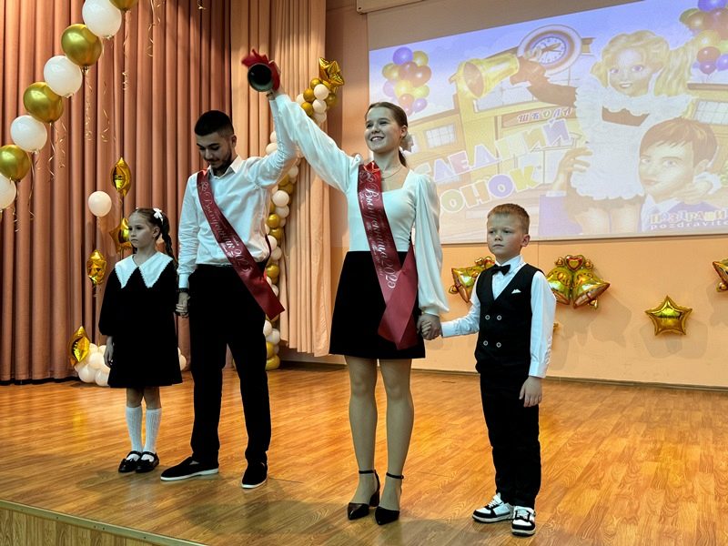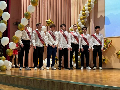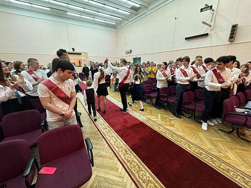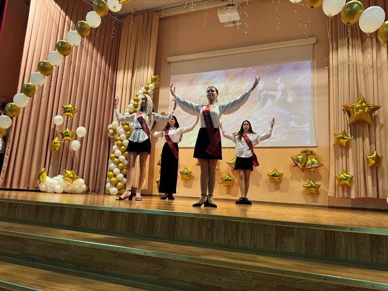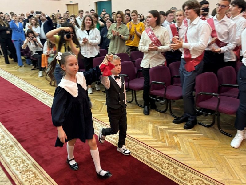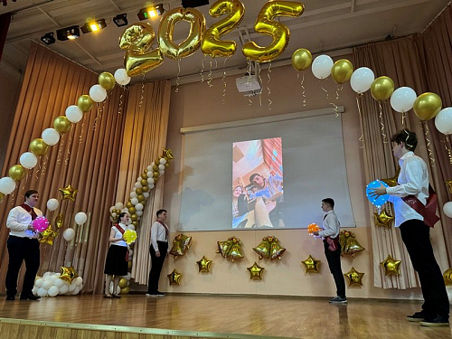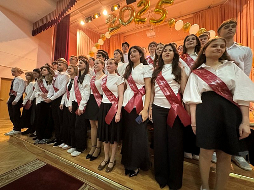 Выпускники, учащиеся 11-х двух классов, школьники, учителя и родители собрались в актовом зале школы. Прозвучал Гимн Российской Федерации.