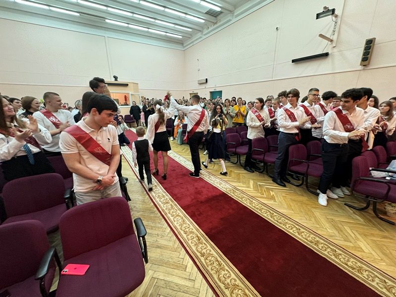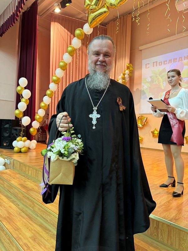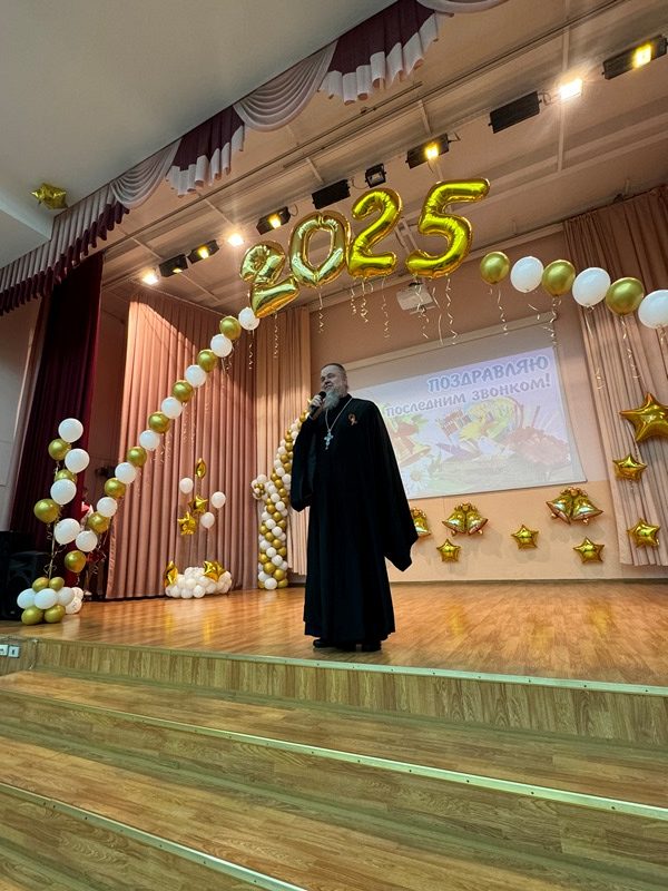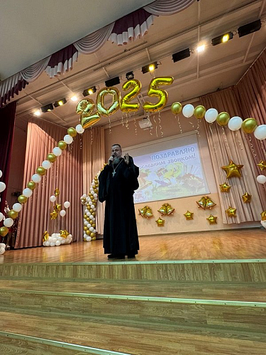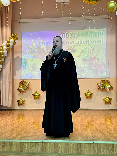 Перед залом выступил игумен Дамиан, который сердечно поздравил выпускников с окончанием школьных занятий и напомнил им о том, что надо беречь время, ведь они поступали в школу еще маленькими детьми, тогда когда храм Святого адмирала еще только начинал строиться, а теперь и храм построен и они выпускники, а все начиналось как будто вчера. Отдельные слова благодарности прозвучали в адрес заместителя директора, руководителя структурного подразделения, Максюты Надежды Ивановны, родителей и учителей. Также игумен Дамиан напомнил выпускникам, что в эти дни празднуется и 80-летие Великой Победы нашего Отечества над фашизмом, он пожелал победы им на выпускных экзаменах и в жизни. Закончил свое слово настоятель пасхальным возгласом: «Христос Воскресе!».