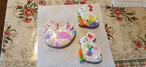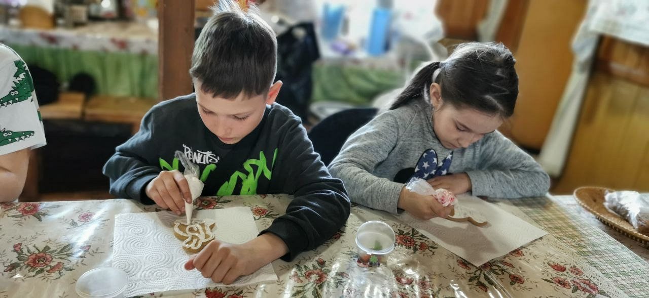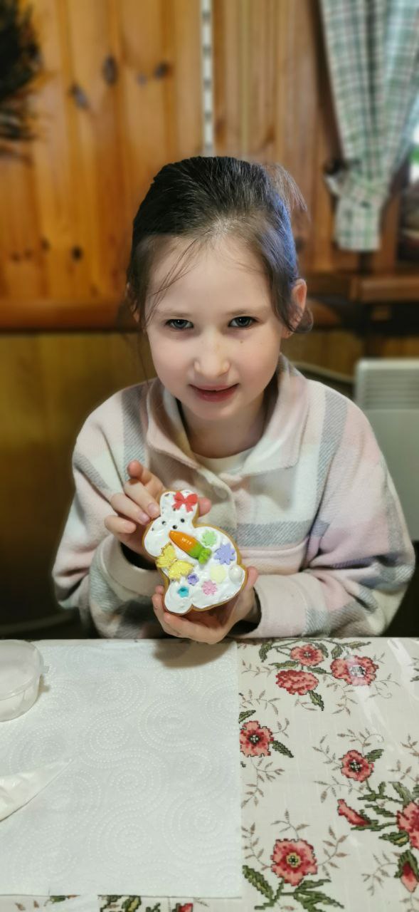 Каждый получил свой набор: пряник в виде зайца или цыпленка, цветную глазурь и сахарные украшения. С помощью кондитерских мешков ребята начали создавать свои шедевры.