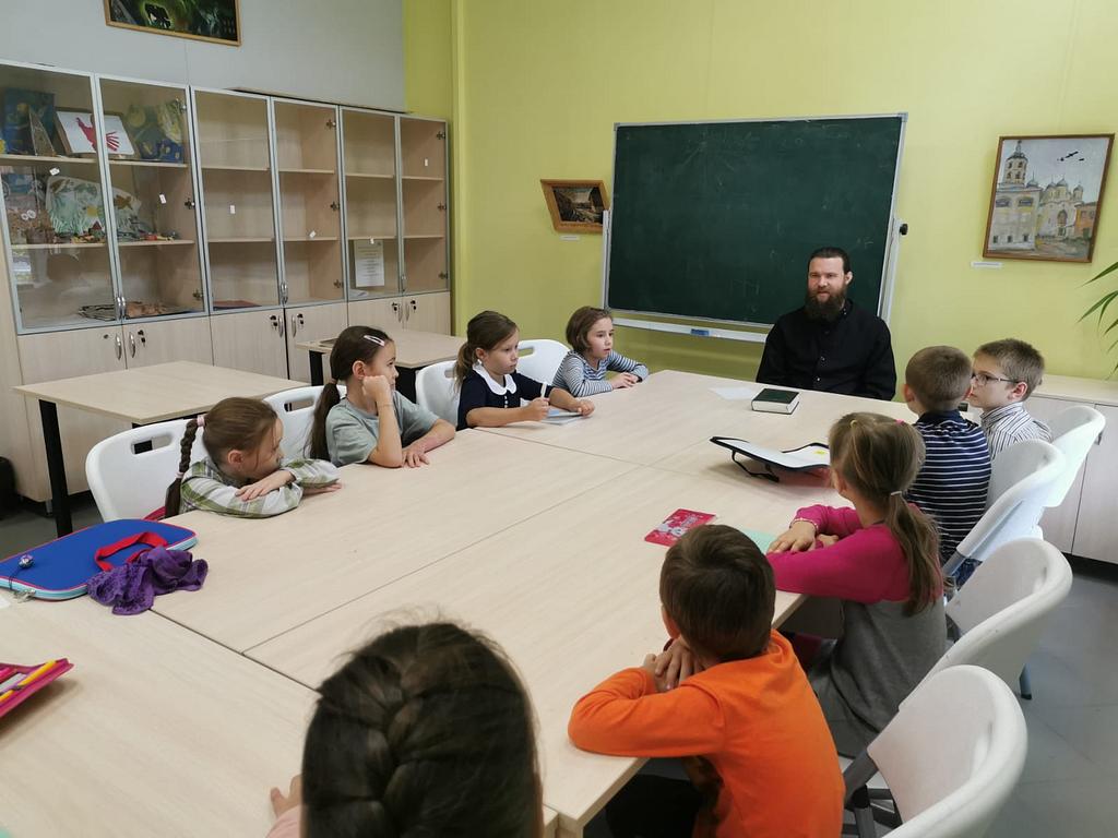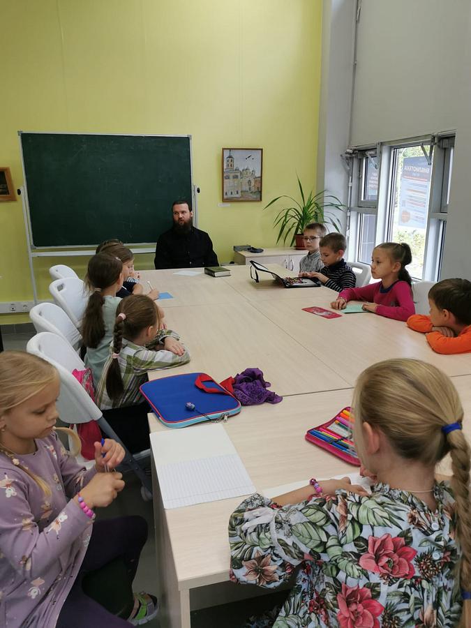 На первом в этом учебном году занятии настоятель храма поприветствовал ребят, обсудил с ними предстоящие планы на новый учебный год и познакомил их с предметами, которые они будут изучать.