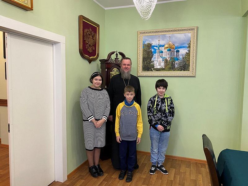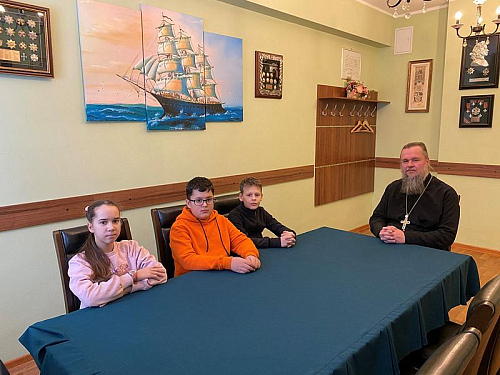 Настоятель рассказал ребятам об особом почитании в России святых апостолов Андрея Первозванного и Симона Канонита. С первым связано учреждение главного ордена России и Андреевского флага. С именем второго апостола связано основание Ново-Афонского монастыря в Абхазии.