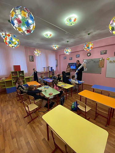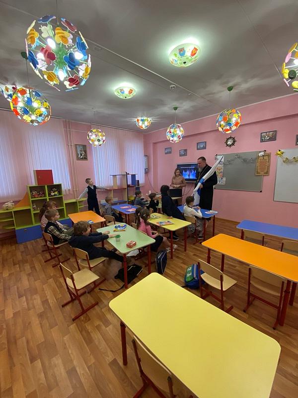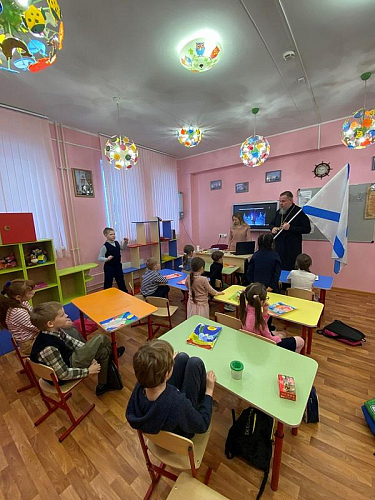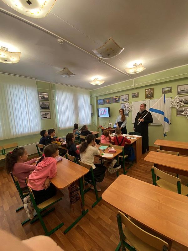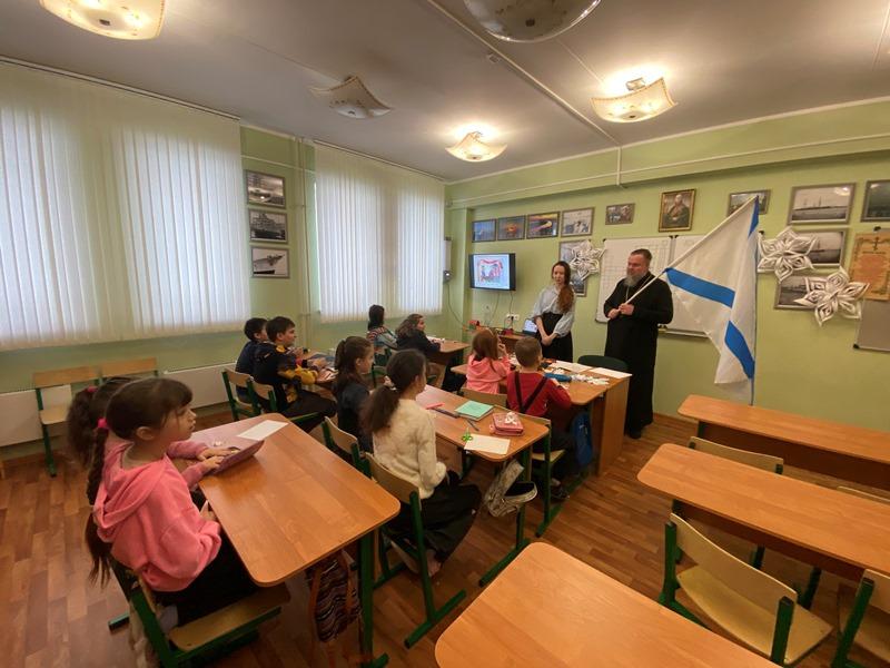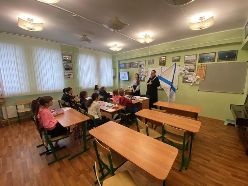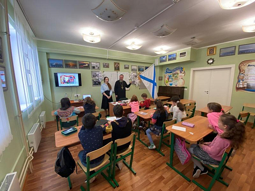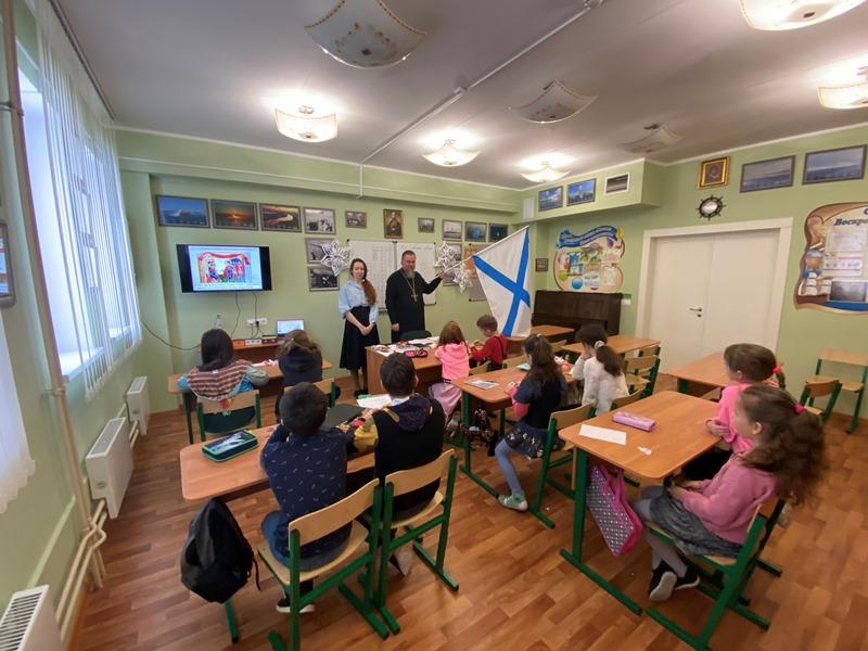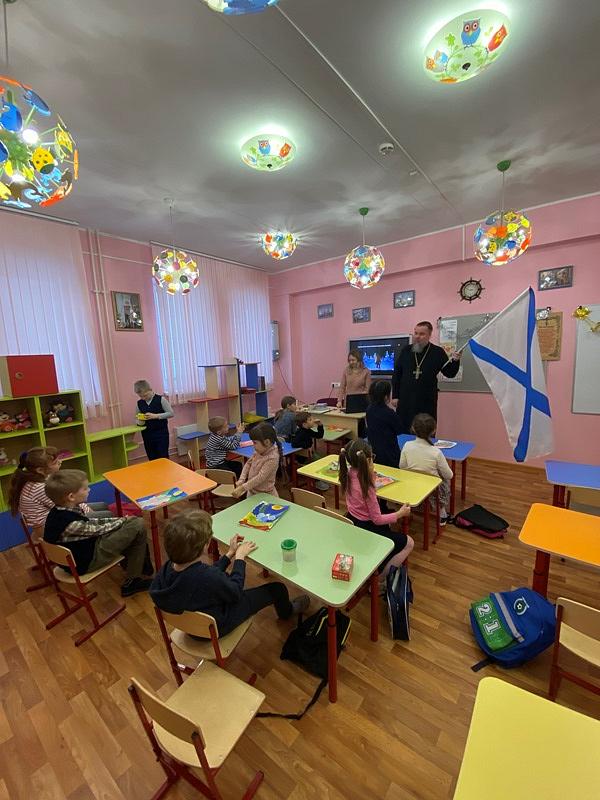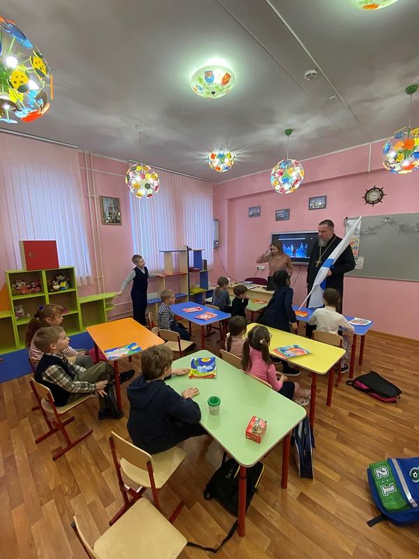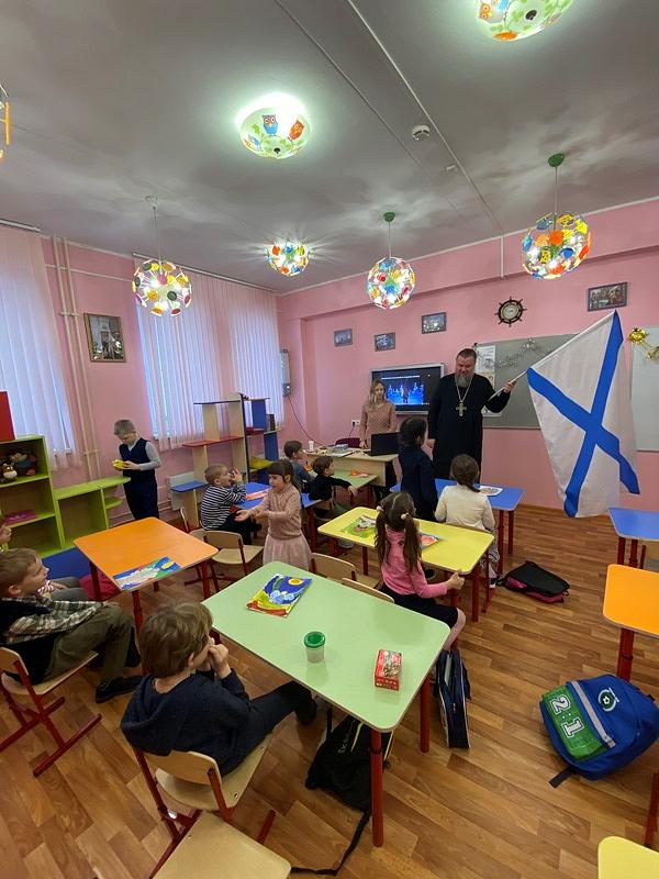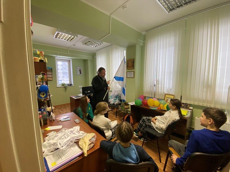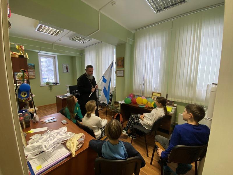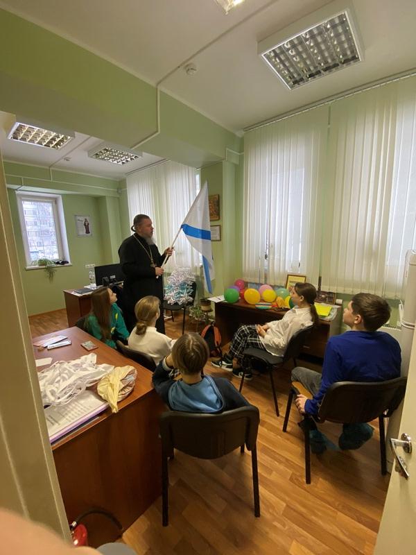 Игумен Дамиан взял с собой Андреевский флаг и посетил ребят в аудиториях дома причта, где проходили уроки. Во время встречи настоятель и ребята разобрались с такими вопросами как: