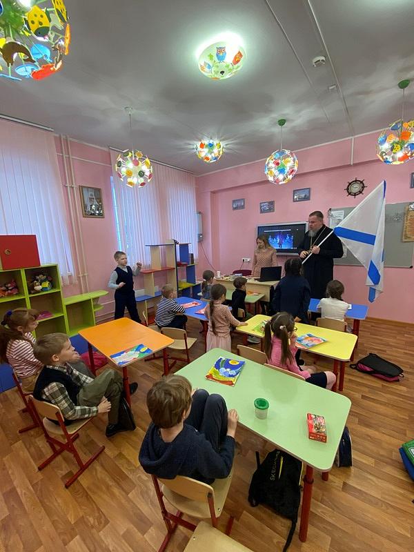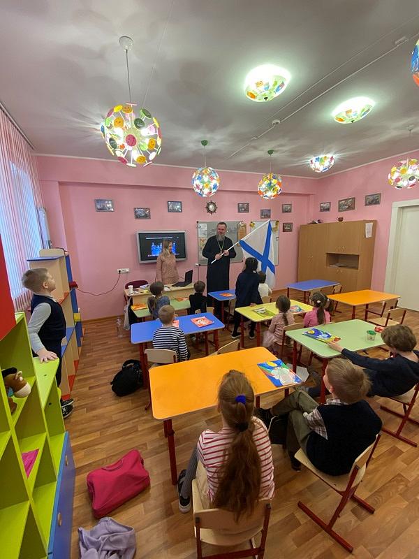 11 декабря 2022 года, в День Андреевского флага, в Воскресной школе при храме святого праведного воина Феодора Ушакова в Южном Бутове прошли беседы об Андреевском флаге.