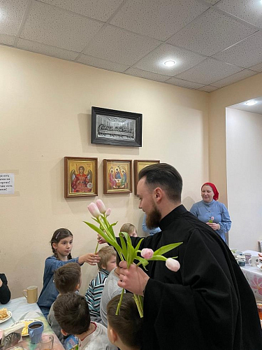 Во время чаепития директор Воскресной школы диакон Константин Бабак поздравил учащих, учащихся и родителей с праздником святых жен-мироносиц.