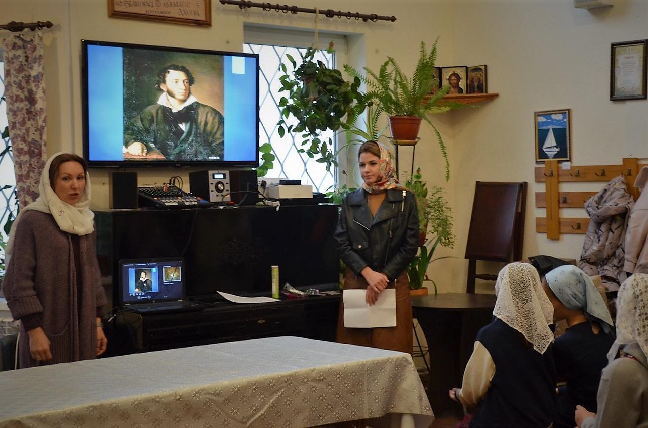 В рамках подготовки ко Всероссийскому ежегодному творческому конкурсу «Красота Божьего мира», который в этом году посвящён Александру Сергеевичу Пушкину, в Воскресной школе состоялось комплексное занятие, провели которое директор Воскресной школы Екатерина Вадимовна Гришина и педагог русского языка и литературы, филолог, Дарья Павловна Алифонова.
