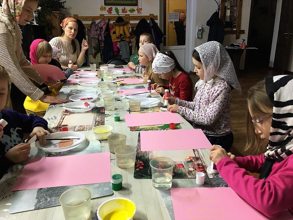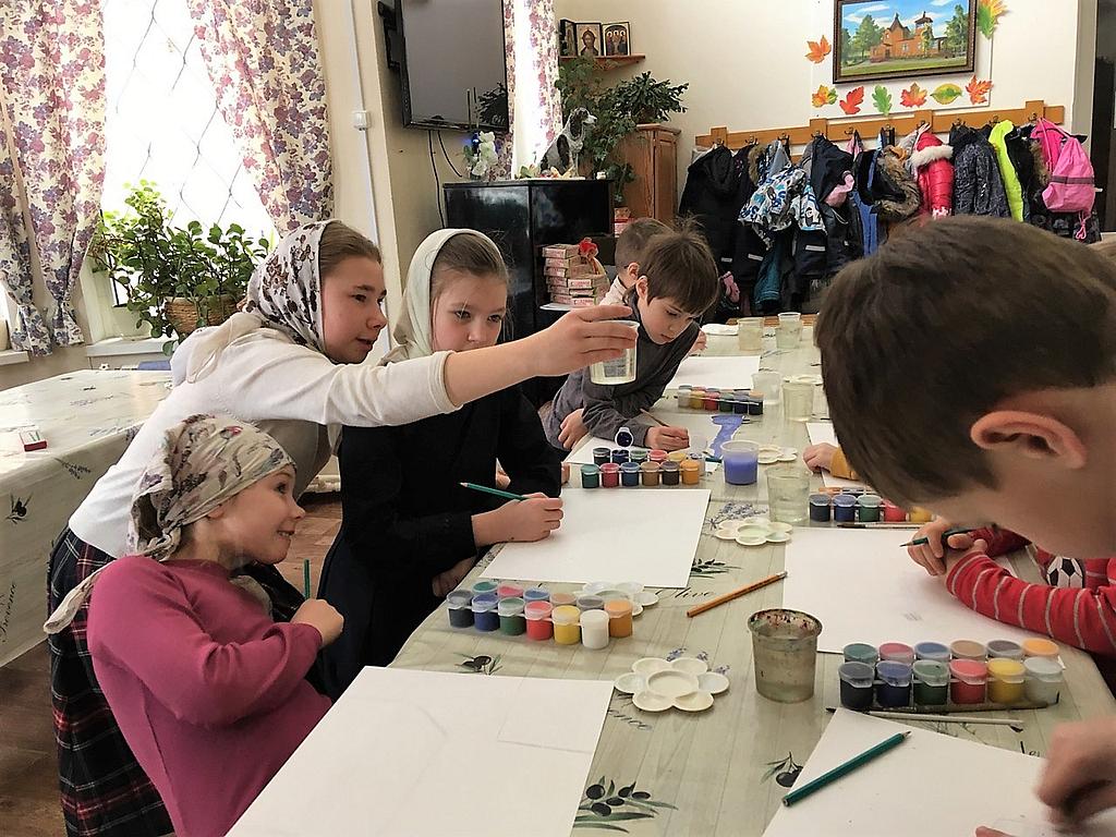 В этот раз творческое занятие провела выпускница Воскресной школы Алексеева Варвара. Не смотря на свой юный возраст, Варя серьезно увлекается живописью. Поэтому в начале занятия она рассказала о правилах расположения листа, жанрах изобразительного искусства, а в процессе занятия направляла ребят и помогала рисовать.